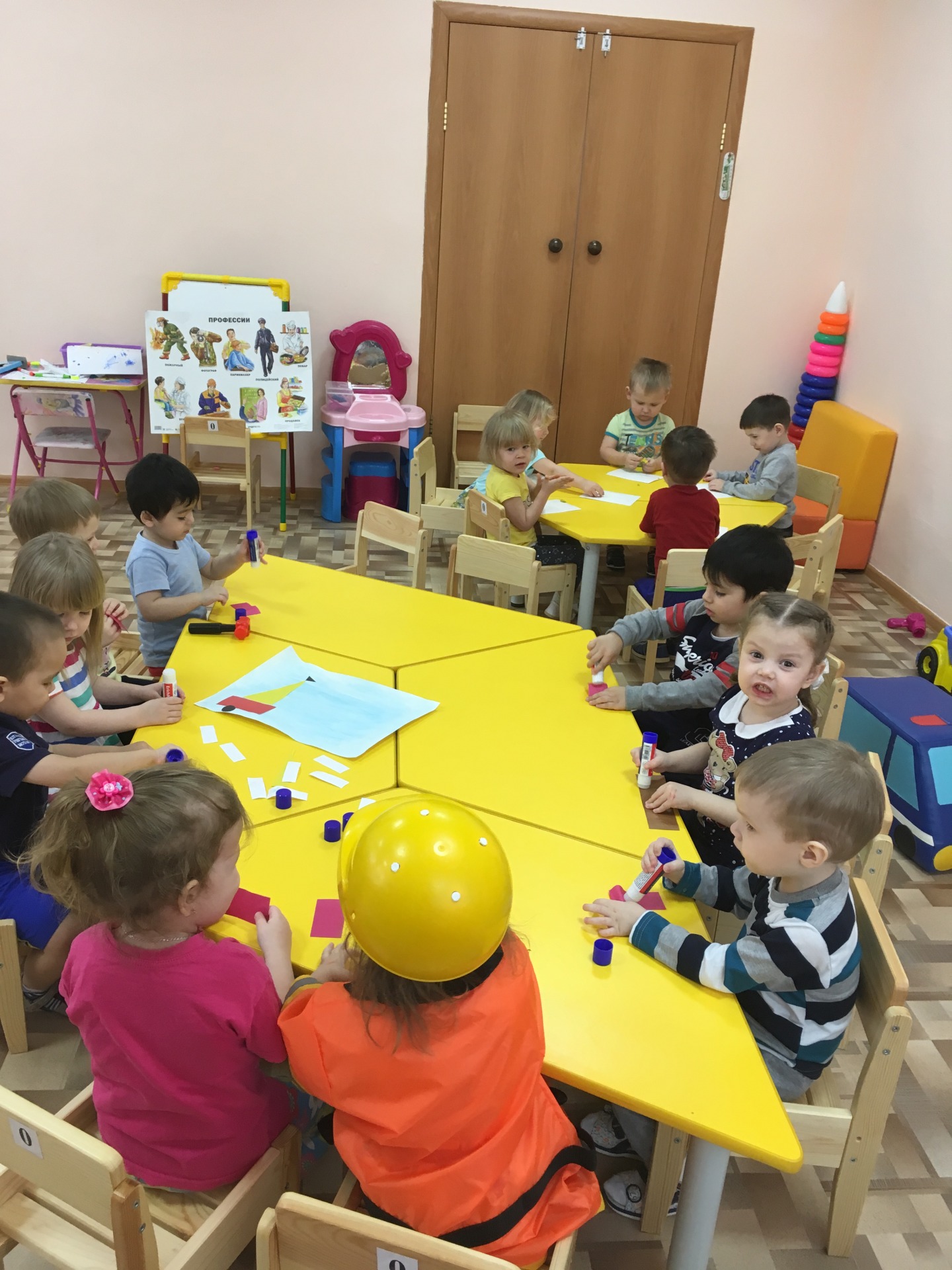 Завершающим мероприятием была образовательная деятельность «Строители», где дети выполнили коллективную аппликацию и изготовили совместно с родителями альбом «Признаки профессий».