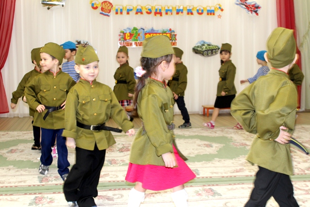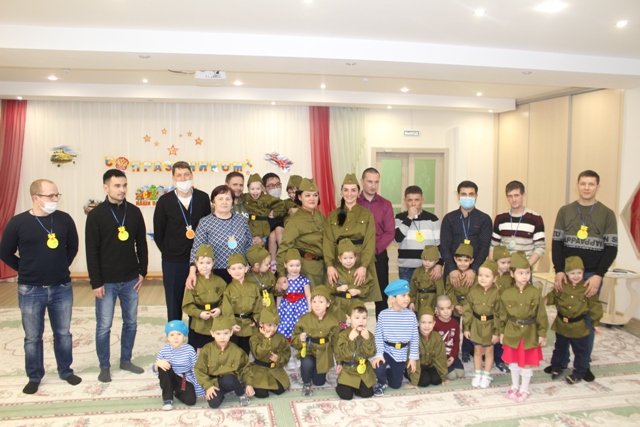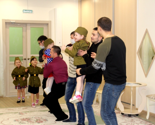 На утренник дети пригласили своих пап, и они тоже повеселились на славу: играли в игры: «Рота, подъем!», «Шарики и кубики», «Ценный груз».