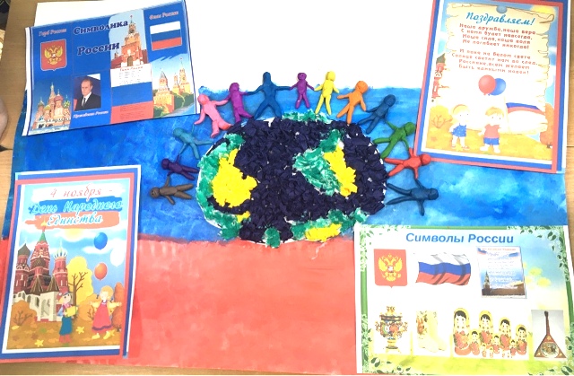Воспитанники сделали коллективную работу «Дружба народов», посвященную празднику. В непосредственной образовательной деятельности продолжали прививать любовь к Родине, патриотические чувства, все мероприятия способствовали сплоченности детского коллектива. Также расширили знания и представления детей о России, о государственном флаге, гербе, гимне, о народах и национальностях, истории возникновения праздника "День народного единства". В ходе реализации тематической недели научились лепить человека, правильно передавая форму одежды, частей тела, соблюдая пропорции. Закрепили приемы лепки, скатывание пластилина между ладонями, соединяли части, прижимая их плотно друг к другу, сглаживали швы. Неделя прошла продуктивно и интересно.