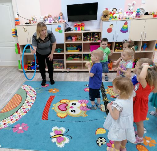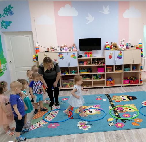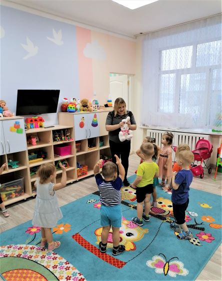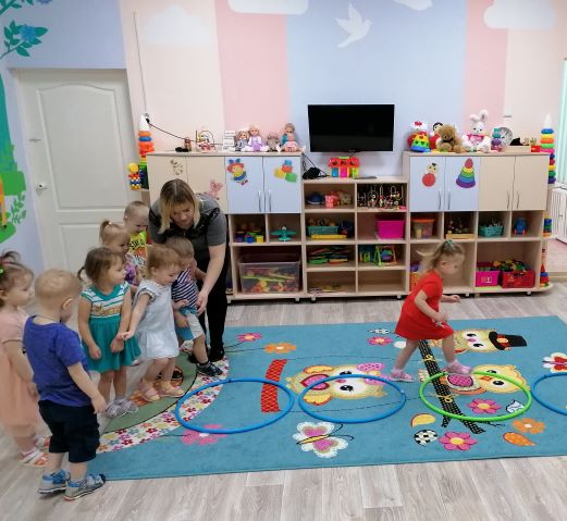 В гости к детям пришли игрушки, с которыми дети играли в подвижные игры «Зайка беленький сидит», «Мишка-косолапый». С помощью игр учились бегать врассыпную, не наталкиваясь друг на друга, бросать мяч двумя руками от груди вперед, попадая в обруч, прыгать через препятствие. В игре малой подвижности «Зайка беленький сидит» учились согласовывать действия со словами, подражать действиям взрослого. В ходе образовательной деятельности дети развивали двигательные навыки, а также получили заряд бодрости и хорошего настроения.