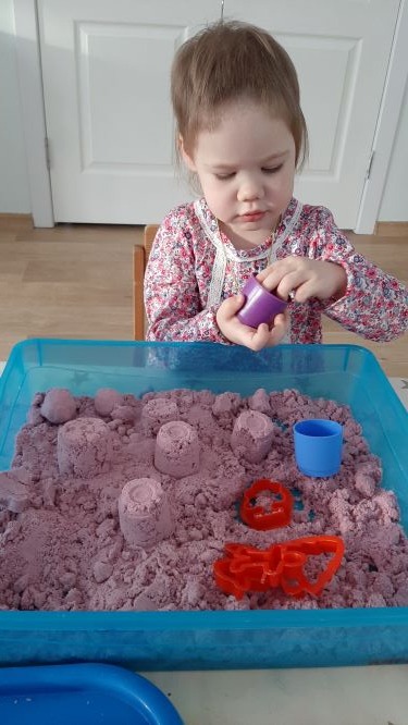 Детей всегда можно заинтересовать играми с песком. Из кинетического песка дети лепили куличи и пряники для куклы Маши. Из сыпучего песка на столе с подсветкой рисовали для цветов стебли и листья, дорожку для машины, в аквариуме рисовали водоросли и волны. Песок использовали для игры «Сыщик», делали отпечатки следов на песке, с помощью песка участвовали в элементарной познавательно- исследовательской деятельности (с помощью воронки пересыпали песок в стаканчик). Данная деятельность, с различными видами песка, позволяет развивать у детей фантазию и творческие способности, мелкую моторику, речевое дыхание, активизировать в речи новые слова. Игры с песком успокаивают активных детей, помогают включать в деятельность скромных и пассивных детей, поднимают настроение.