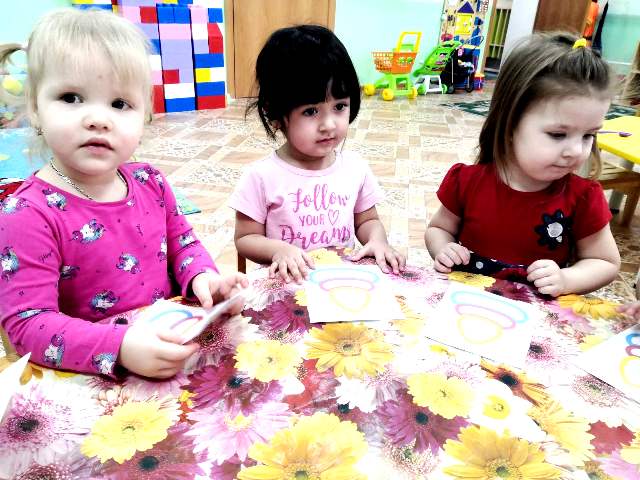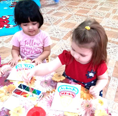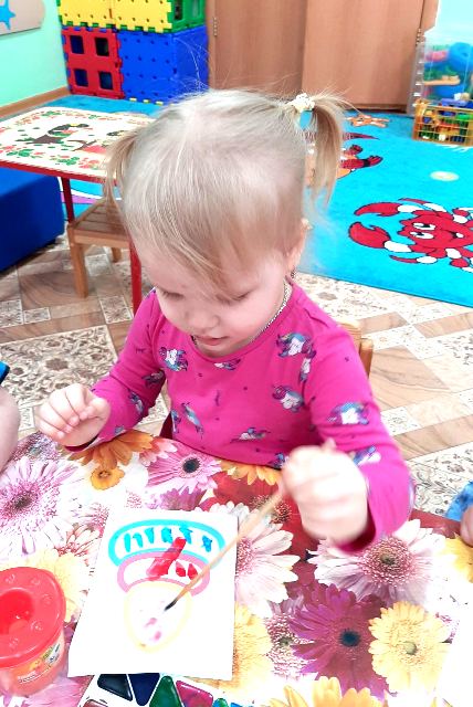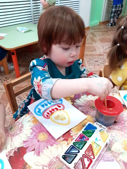 В ходе продуктивной деятельности дети закрепили основные цвета (синий, желтый, красный). Учились правильно держать кисть, набирать краску, оставлять яркие мазки на силуэте пирамидки, промывать кисть в воде, отряхивать кисть о край стаканчика.