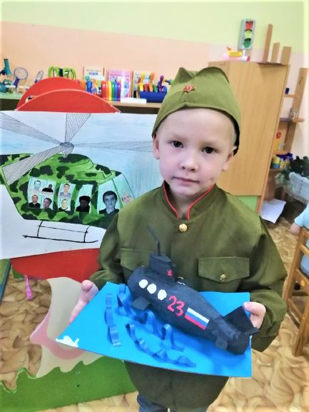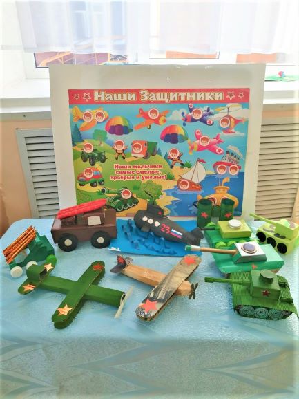 Познакомились с родами Российских войск и с особенностями военной формы наших воинов (головной убор, цвет формы). Беседуя о том, что помогает нашим солдатам защищать Родину, дети узнали, что такое «Военная техника». Чтобы ближе познакомиться с внешним видом и строением военного транспорта, родители приняли активное участие, в совместном творчестве с ребенком пополнили уголок игрушками сделанными своими руками - танки, военные машины, подводные лодки, самолеты. В результате чего получилась замечательная выставка «Наша армия сильна!». В течение тематической недели, посвященной 23 февраля, дети с удовольствием заучивали стихи о защитниках Отечества, отгадывали загадки про военный транспорт, играли в подвижные игры и принимали участие в эстафете.