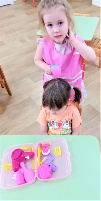 Играли в дидактические и словесные игры: «Кому, что нужно для труда?», «Кому это нужно?», «Собери набор парикмахера, врача, парикмахера», «Отгадай, кто это?».