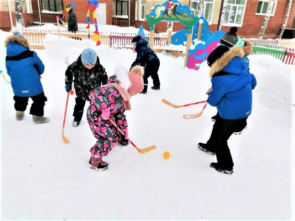 А уж как мы ждём зимы, чтобы поиграть в хоккей – пара на пару! Весёлые игры, задорный смех не дают замёрзнуть на прогулке! И только вернувшись в группу, понимаем, что по телу разливается приятная усталость.