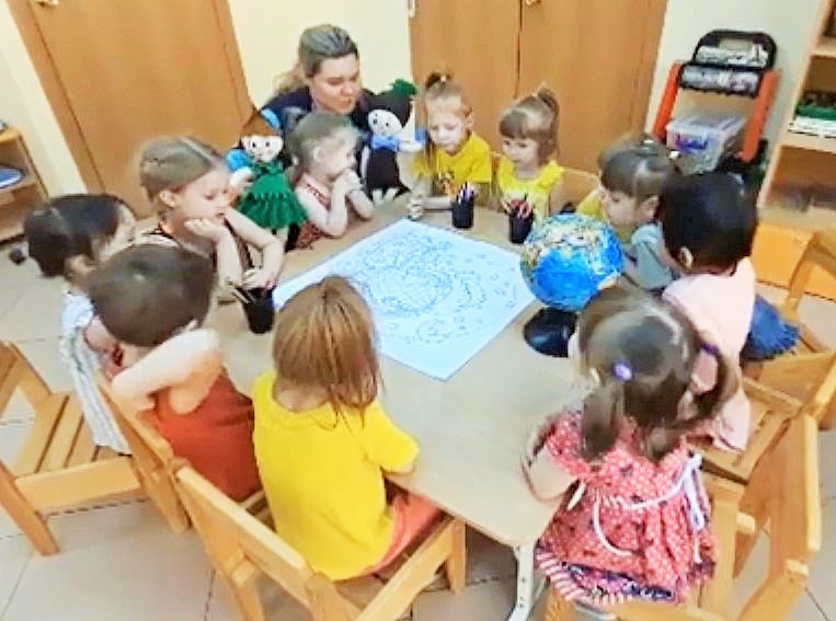 После интересной беседы с детьми «Эколята» предложили им разукрасить изображение глобуса на мега-раскраске, используя для примера настольный глобус. Дети с большим удовольствием принялись за работу.