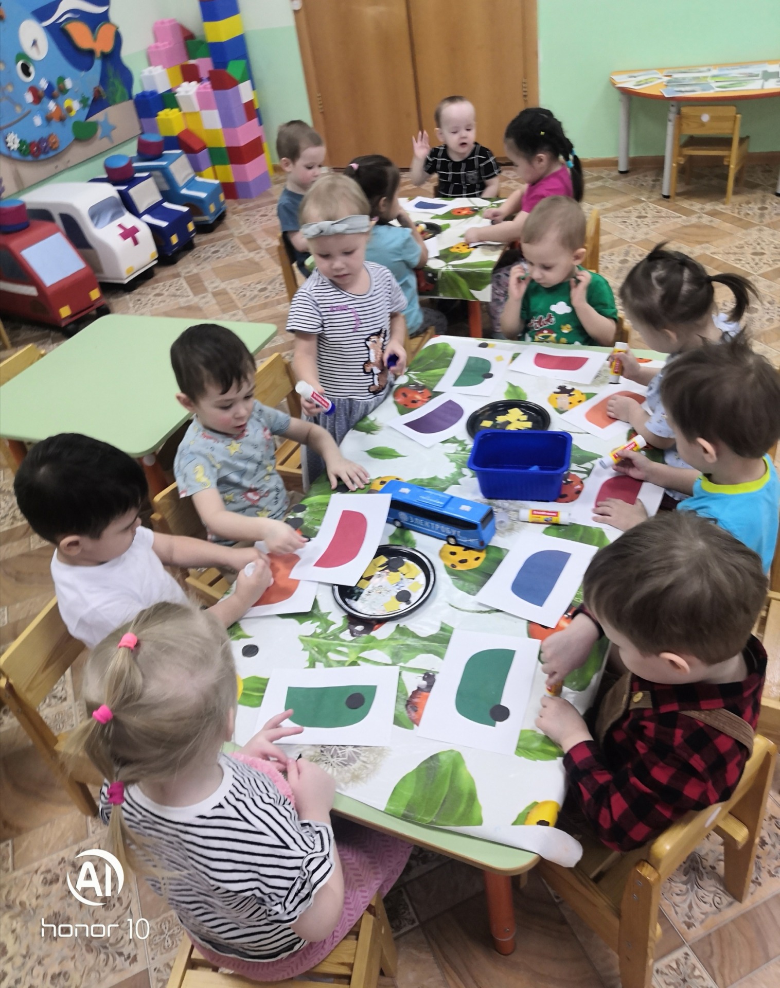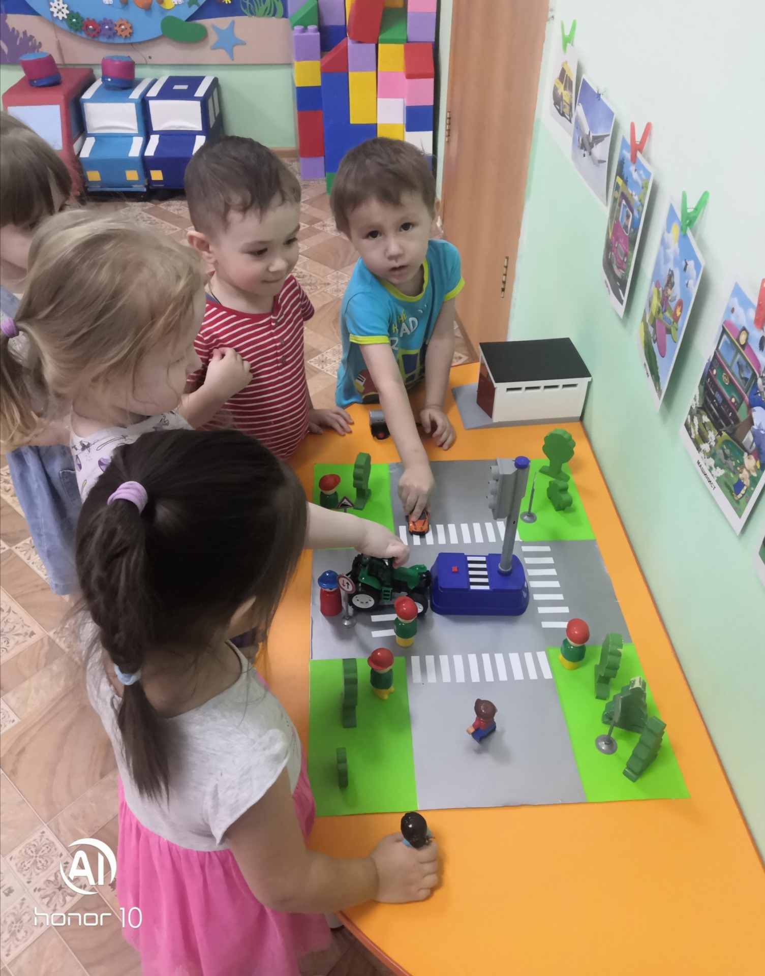 В первой младшей группе «Карапуз» дети знакомились с разными видами транспорта. В течение недели мы рассматривали игрушки (самолет, поезд, корабль, машины) иллюстрации с транспортом. Строили гараж и дорогу для машин. Рисовали дорогу для машин, делали аппликацию автобус, лепили самолеты. Играли в игры с водой, пускали кораблики.