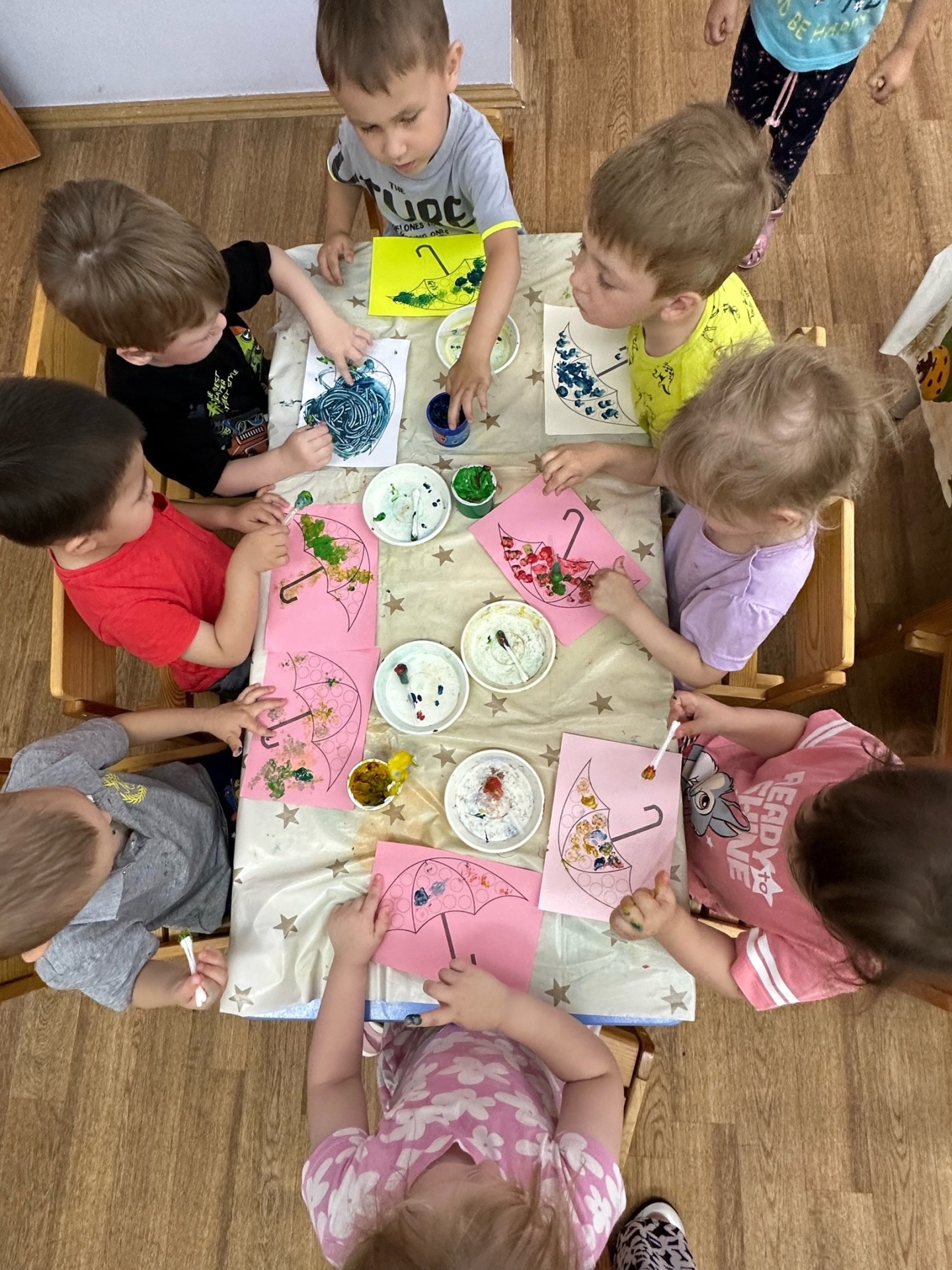Малыши помогли зайчику раскрасить зонтики яркими красками в нетрадиционной технике рисования - с помощью «ляпушек» и ватных палочек. В подвижной игре «Солнышко и дождик» упражнялись в умении бегать, не наталкиваясь, сохранять равновесие.