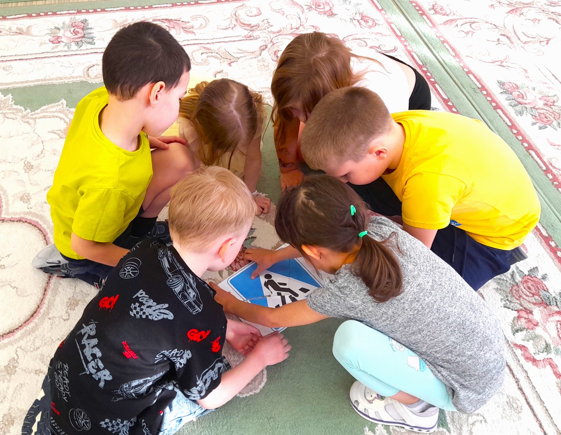 Встреча проходила в игровой форме – дети выполняли задания и за каждое правильно выполненное задание получали жетоны в виде части одного из дорожных знаков.