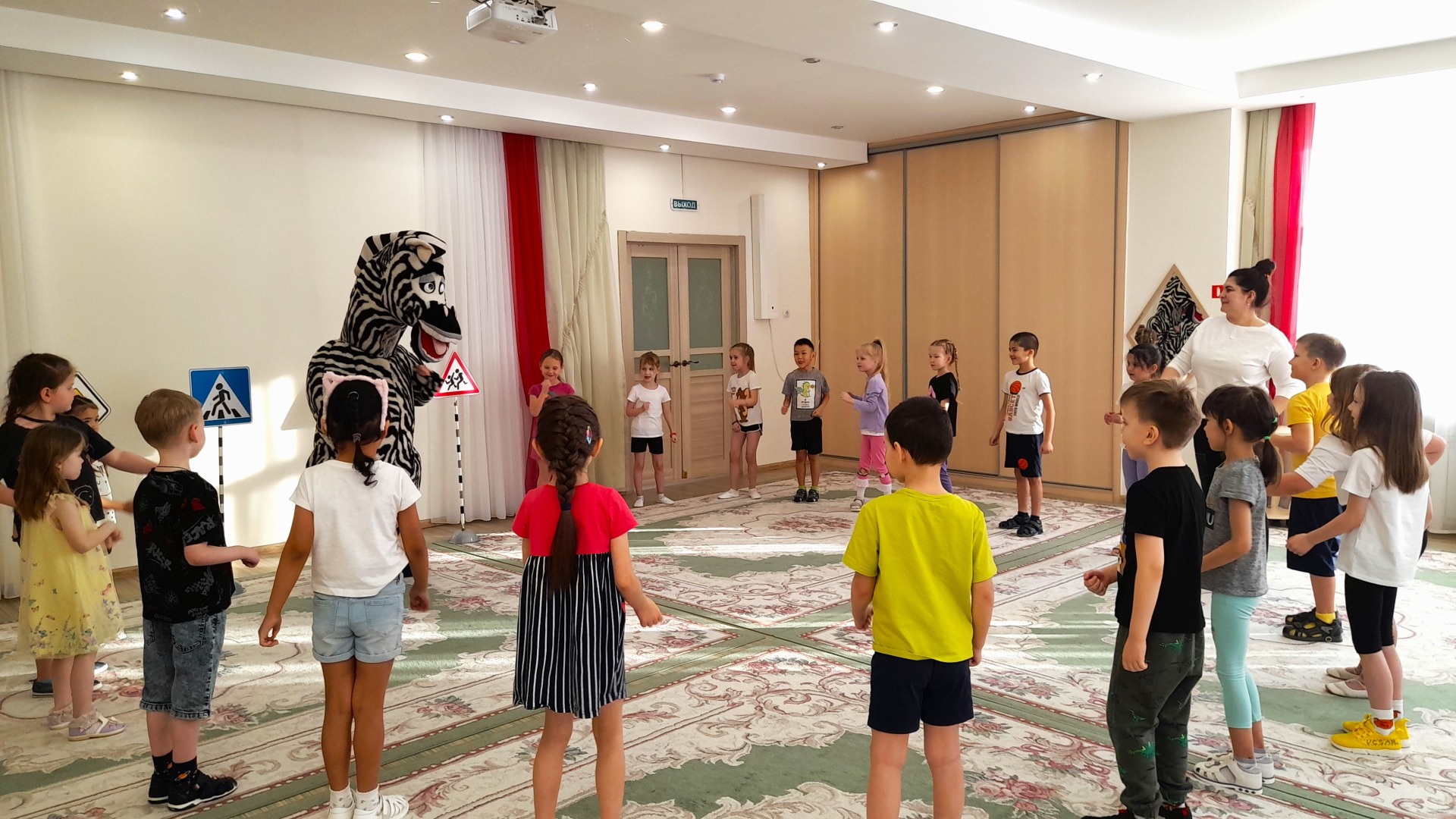В ходе мероприятия ребята закрепили значения сигналов светофора, вспомнили правила дорожного движения; поиграли в игры различной направленности: «Светофор, переход, автомобиль», «Глазомер», «Отгадай дорожный знак», «Собери жетоны»; потанцевали под обучающую песню «Колёсики, колёсики и красивый руль».