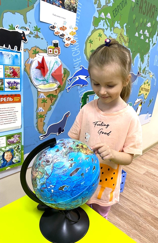 Познакомились с глобусом, определили, где на нем находятся океаны, моря, реки.