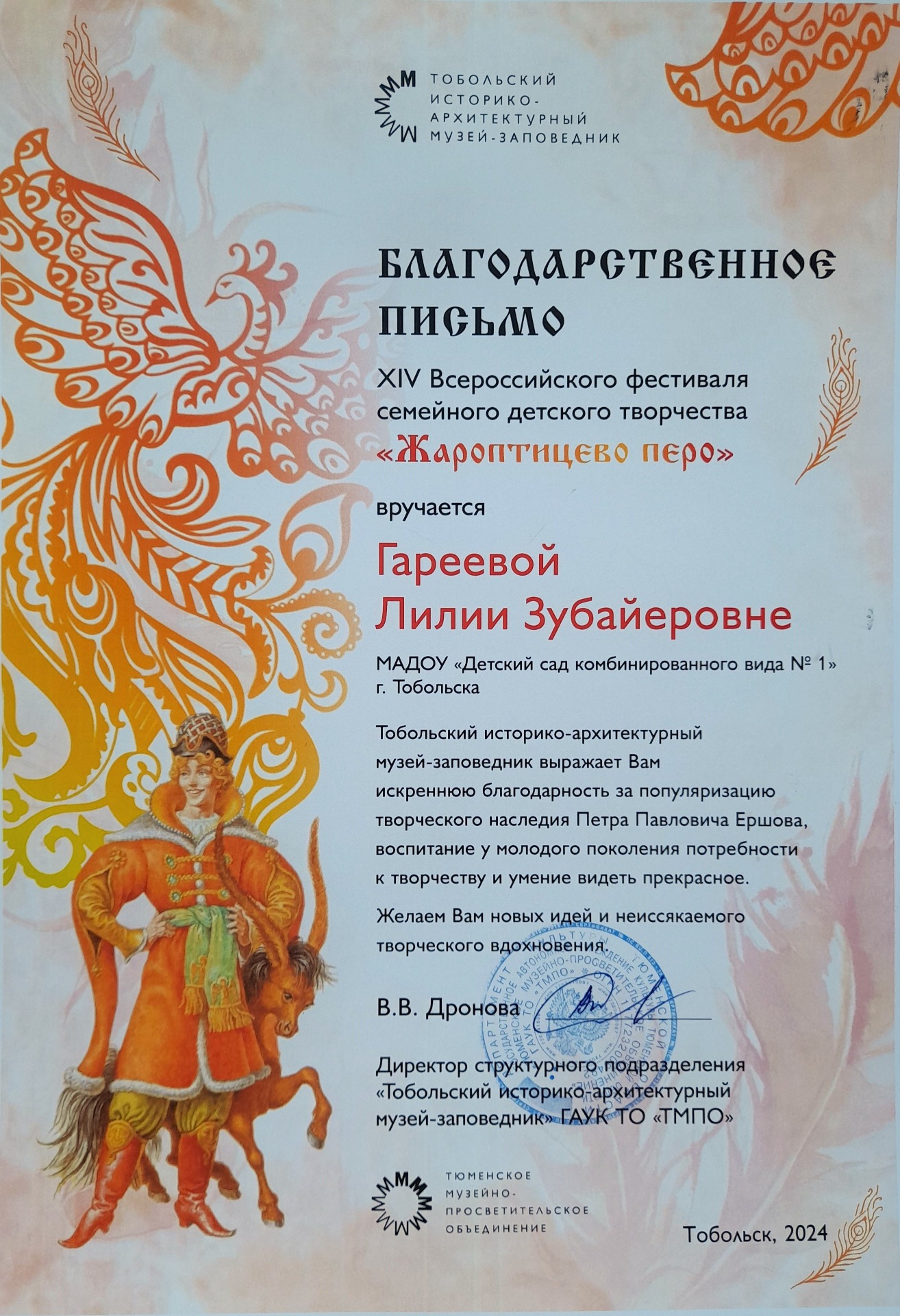 В начале 2024 года Тобольский историко-архитектурный музей-заповедник объявил о проведении XIV Всероссийского фестиваля семейного детского творчества «Жароптицево перо - 2024», посвящённого литературному наследию и творчеству Сибирского поэта, прозаика и драматурга Петра Павловича Ершова.