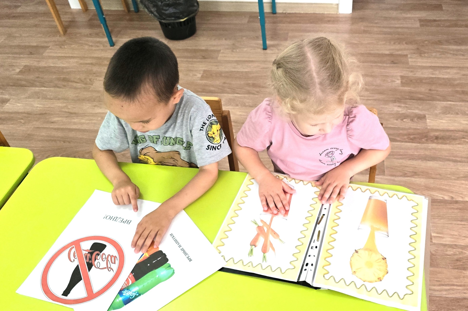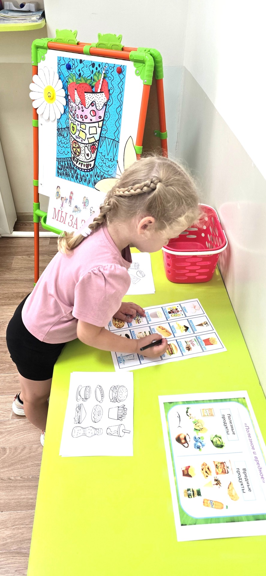 С детьми проводились беседы с мультимедийными презентациями «Здоровое питание», «Правильное питание – залог здоровья», «Овощи и фрукты», «Вредная еда», тематические беседы на темы «Вредные и полезные продукты», «Что такое режим питания?». Познакомились с понятием «витамины". Закрепили знания о необходимости наличия витаминов в организме человека, о пользе продуктов, в которых содержатся витамины. Были проведены дидактические игры «Отгадай-ка», «Что какого цвета?»; сюжетно - ролевые игры «Овощной магазин», «Огород»; игровые упражнения «Подсолнухи», «Кто быстрее соберёт», подвижные игры «Огородная – хороводная», «У медведя во бору». После этого, дети рисовали, лепили и делали аппликации своих любимых овощей и фруктов.