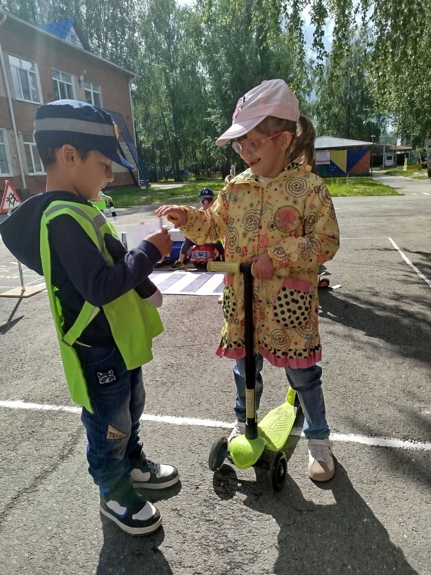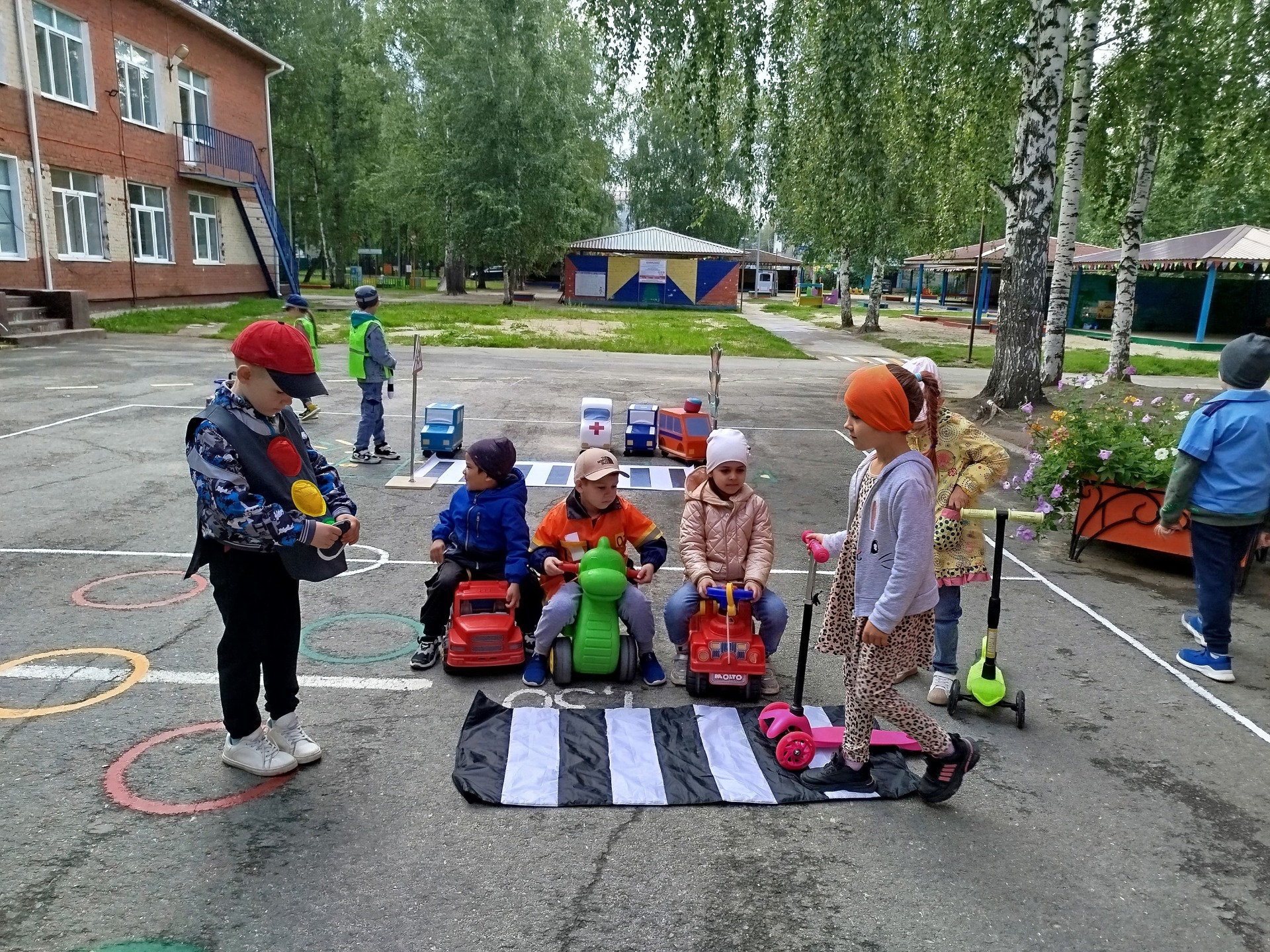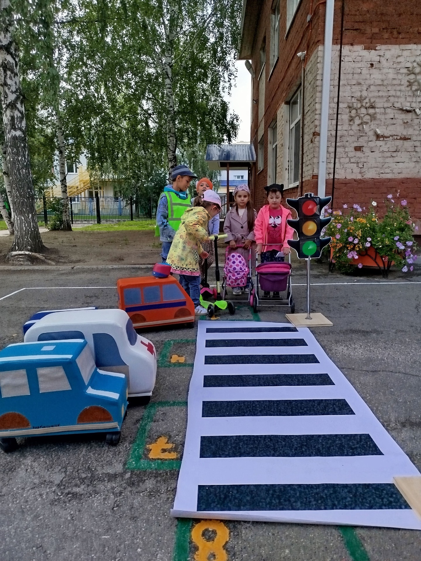 Дети сделали разметку на дороге, расставили дорожные знаки и распределили роли. Прогулка прошла интересно, водители и пешеходы старались выполнять все знакомые правила.