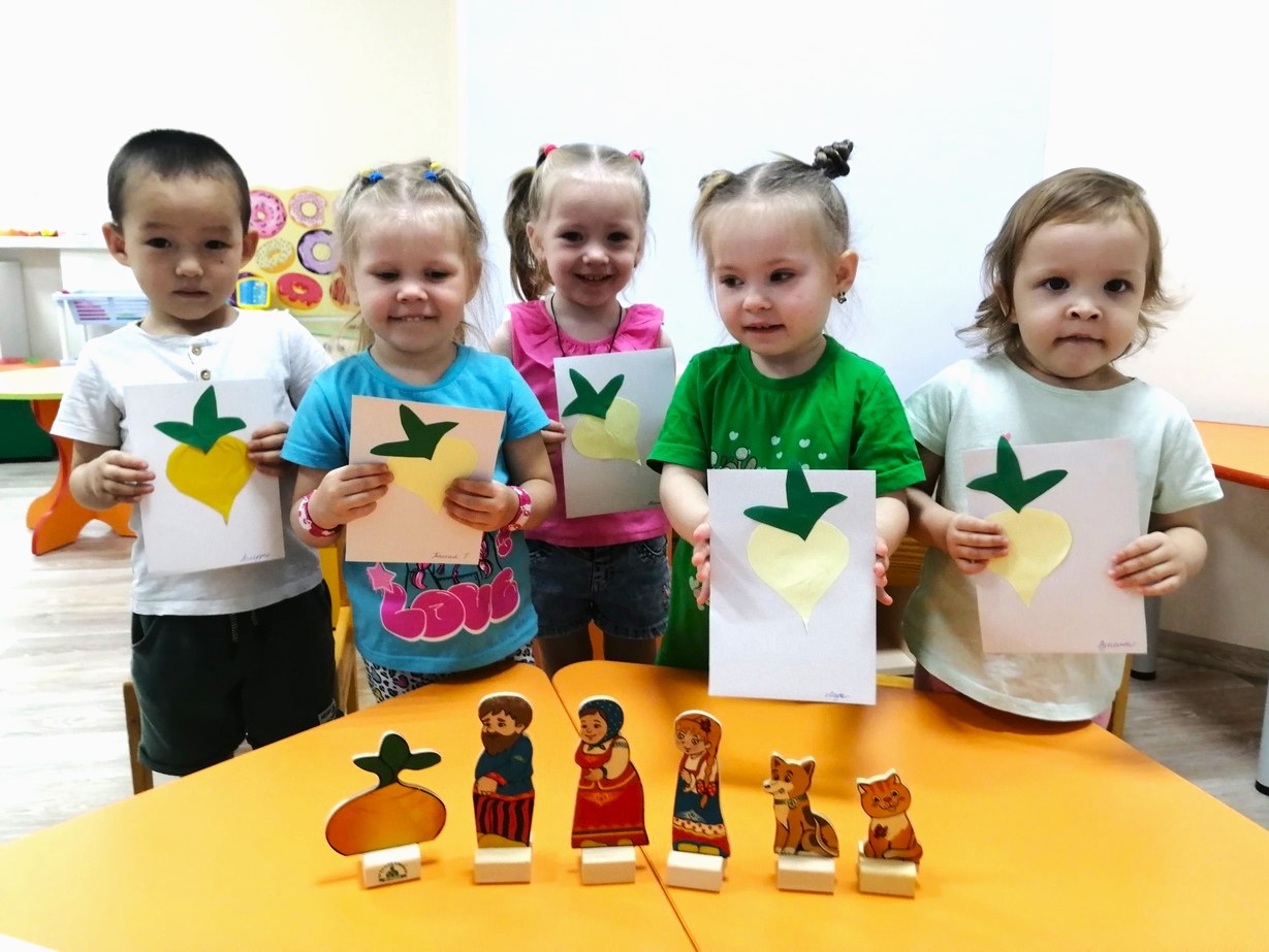 Дети младшей группы «Земляничка» в рамках реализации темы «Подарки осени» продолжали знакомиться с театральным творчеством. Развивали речь и творческое воображение через игру с настольным театром и масками по сказке «Репка».