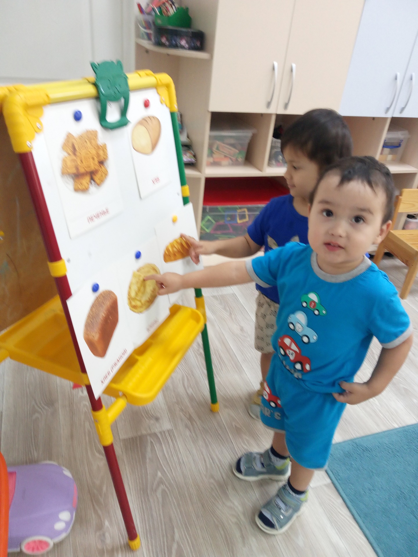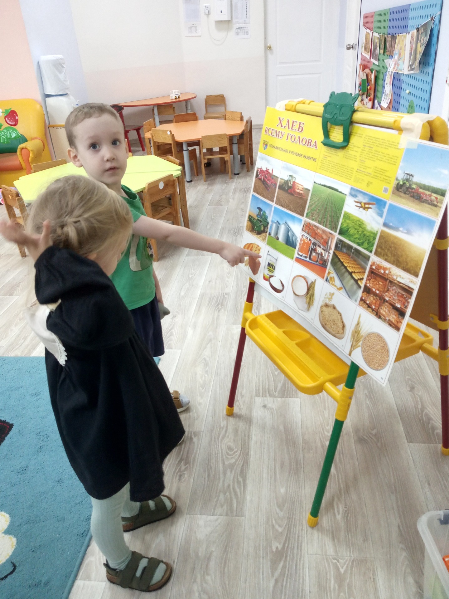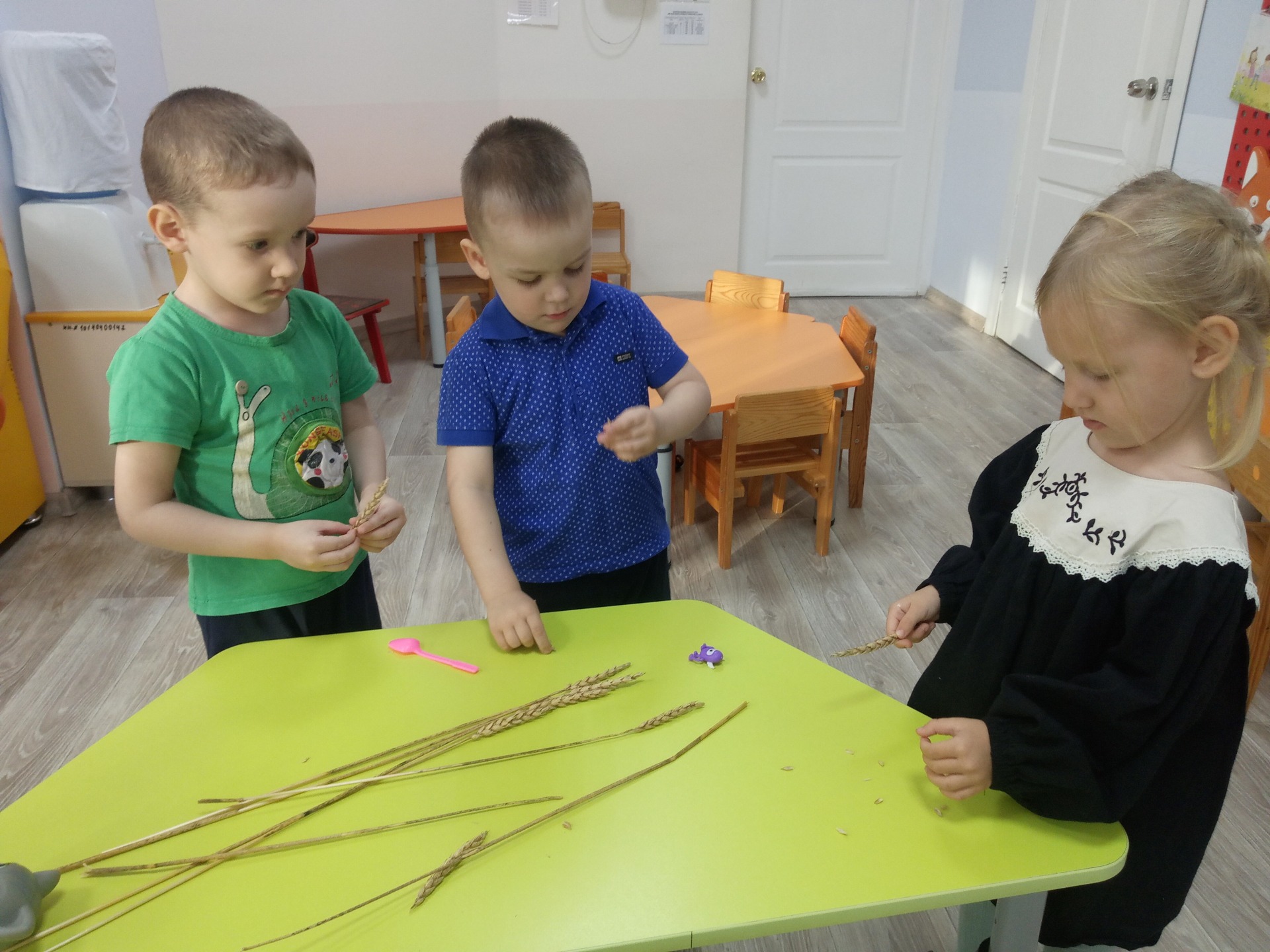 В течение нескольких дней, мы с детьми рассматривали колосья пшеницы и картины по теме, беседовали с детьми: «Как выращивают зерно и делают муку».», «Из чего делают хлеб», «Польза хлеба»; читали сказки: «Колобок», «Крылатый, мохнатый да масляный»; играли в дидактические игры: «Угадай-ка», «Что общего и чем отличаются»; в сюжетно ролевые игры: «Магазин хлебобулочных изделий», «Чаепитие», лепили колосок в технике пластилинография.