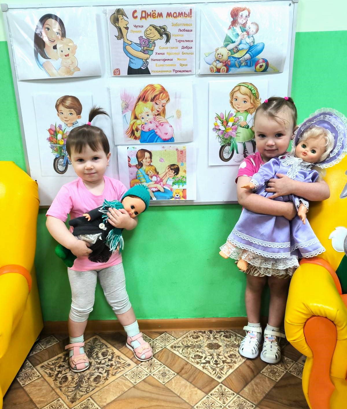 Накануне праздника были проведены беседы: «Как зовут маму?», «Какая ваша мамочка»; дети рассматривали картины, читали рассказы по данной тематике. Смотрели мультфильмы «Домашние животные и их детеныши», «Мама для мамонтенка», слушали песенки о мамочках. Ребята вместе с воспитателями подготовили стенгазету «Любимая мамочка моя», открытки для мам и воздушные шарики в форме сердечек. На празднике детки веселились и танцевали, сопровождая движениями слова песен: «Погремушечка», «Танец с цветами», «Очень любим мамочку».