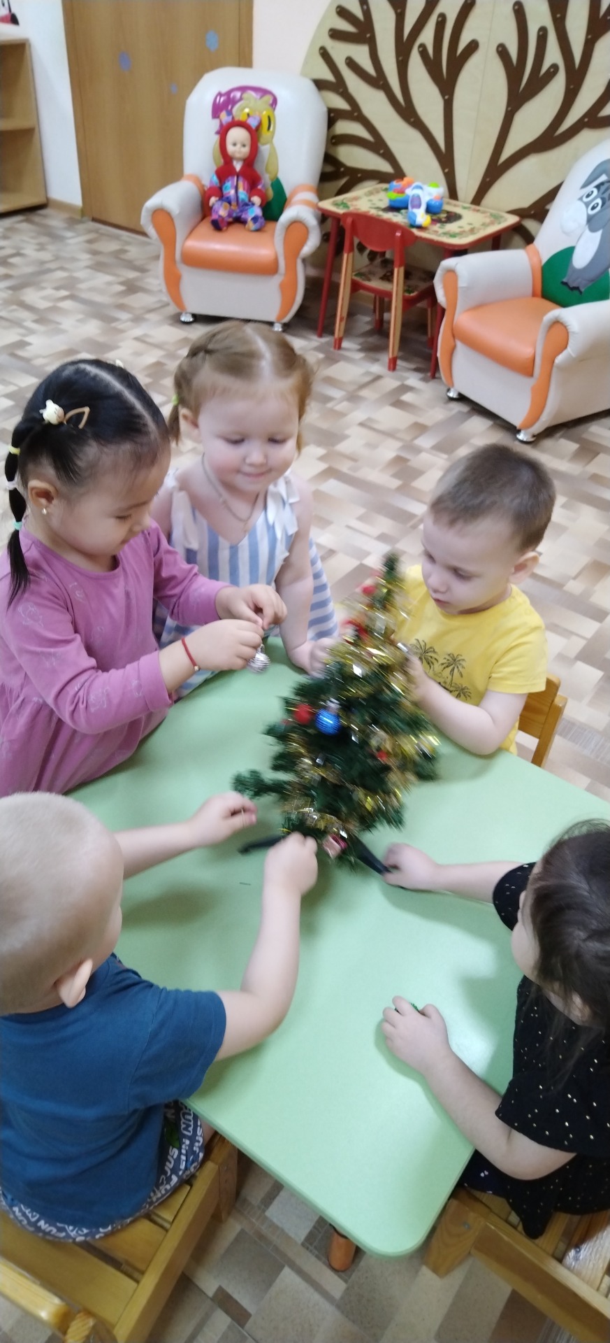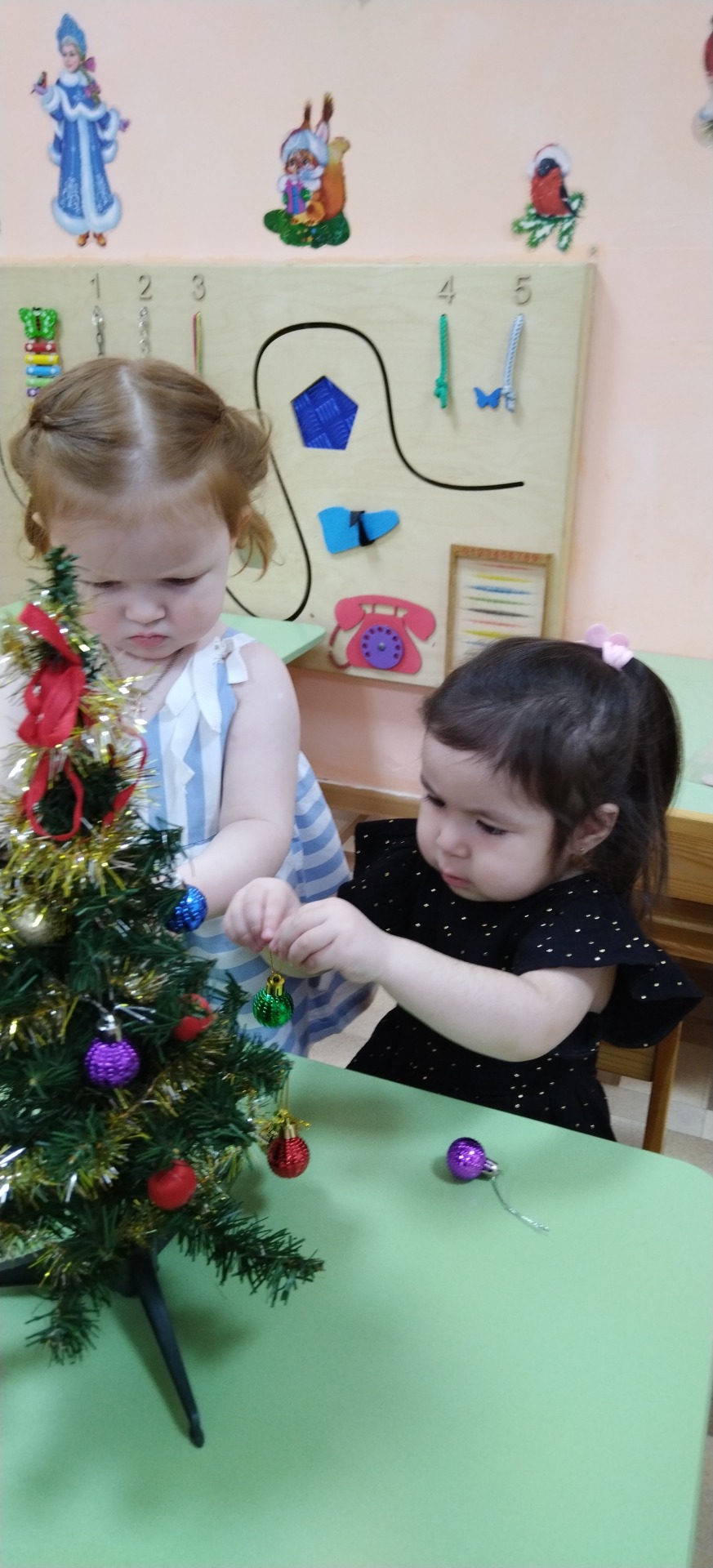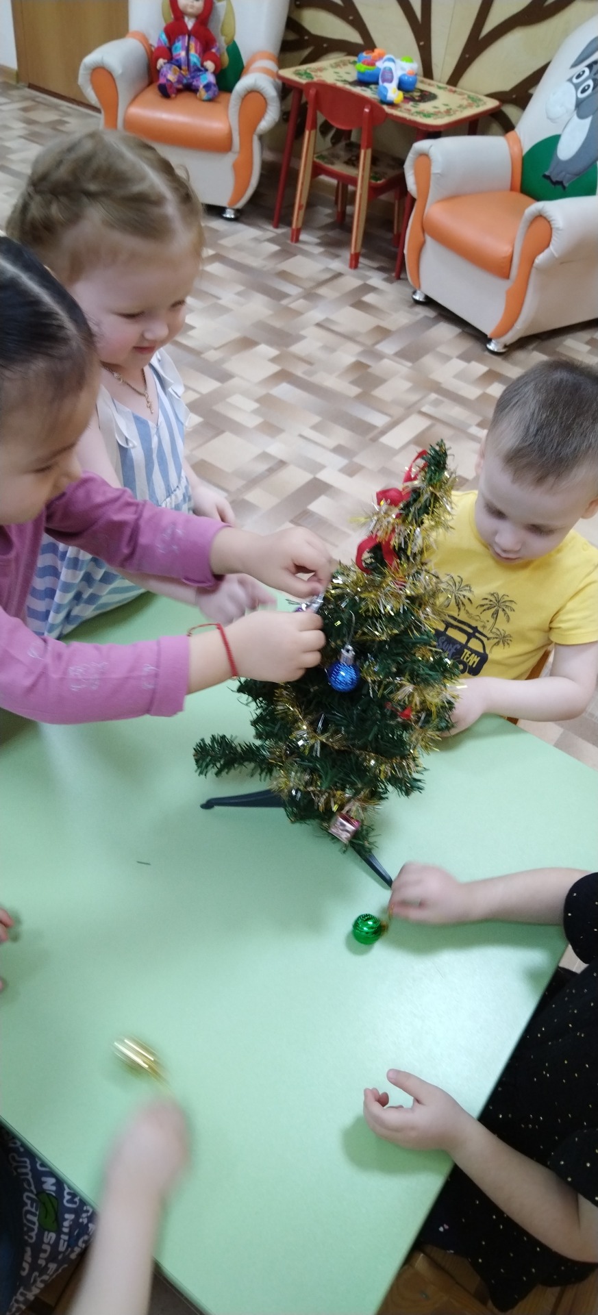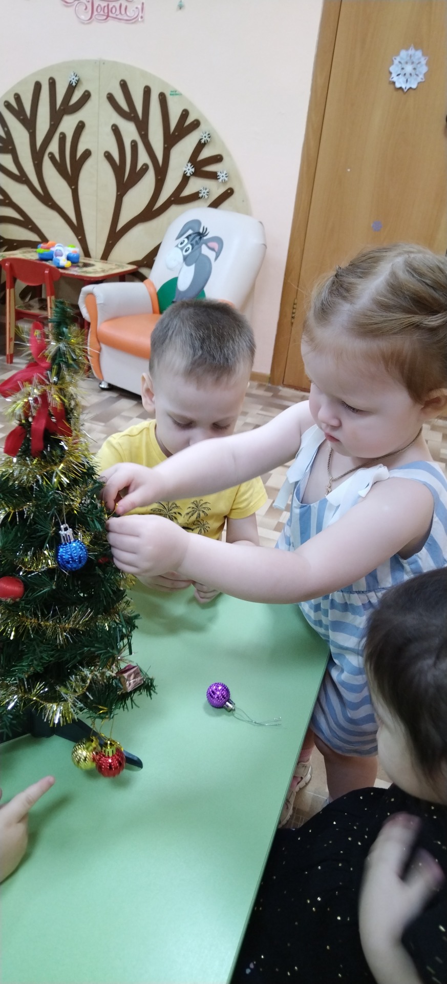 Для наших маленьких «КАРАПУЗОВ» смысл праздника еще не очень понятен, но всем деткам нравится яркие и необычные вещи: им очень приятно посмотреть на украшенную елочку, потрогать разноцветные игрушки, послушать новогодние песенки. Каждый ребёнок приложил свою маленькую ручку к этой красоте: кто-то вешал яркие шарики, кто-то смотрел и запоминал как это делается, а кто-то с гордостью показывал своё умение.