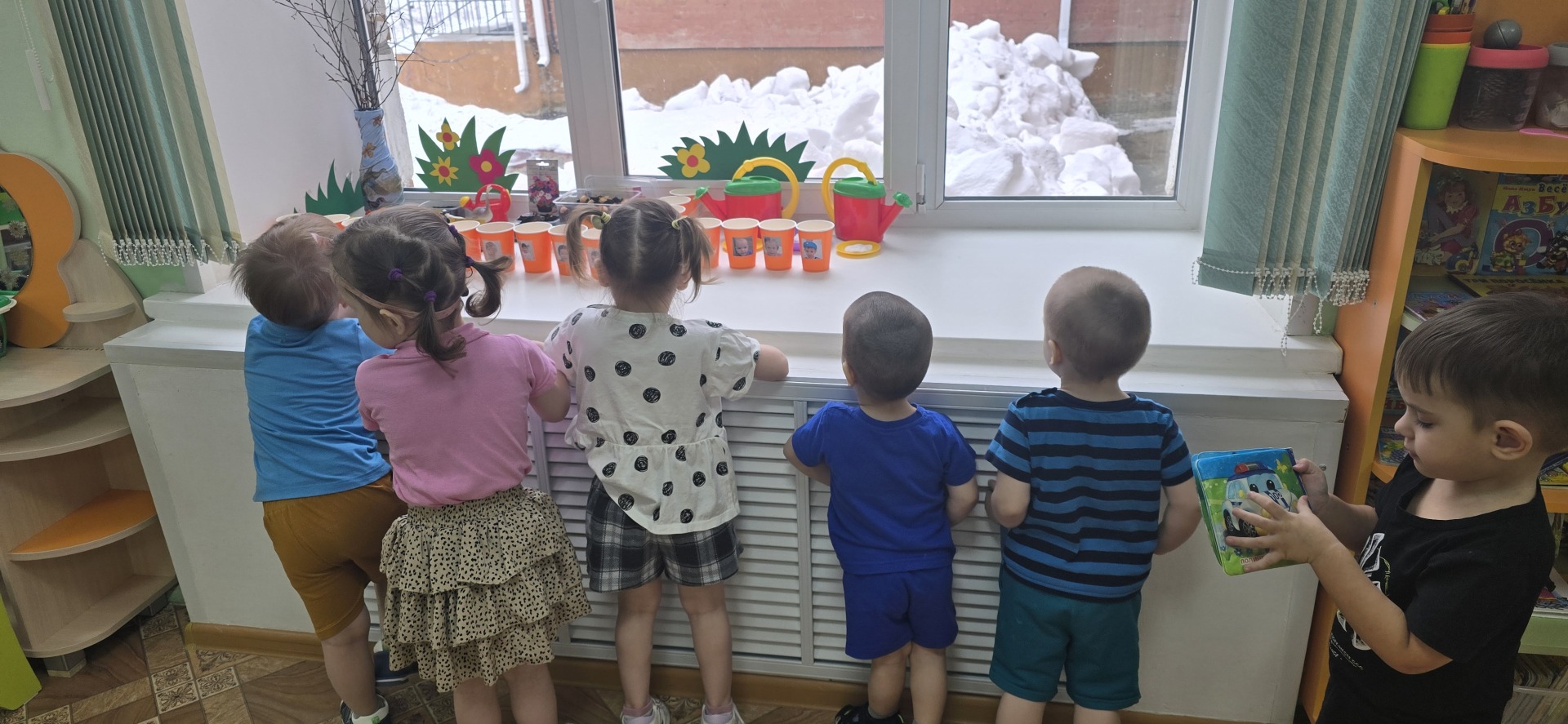 Ребята с помощью воспитателя посадили цветы, лук, петрушку, укроп и поставили веточки тополя. Посадив растения, мы наблюдали и радовались первым всходам. Дети поливают, ухаживают за маленькими росточками.