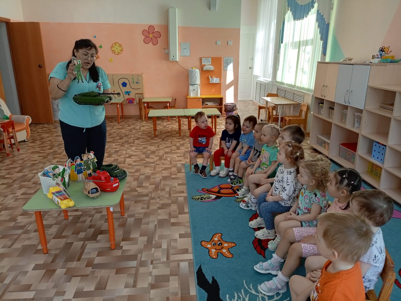 Также мы посмотрели яркую презентацию «Военный транспорт», где малыши с удовольствием рассматривали картинки машин и техники, используемой в армии, и узнали о её важной роли.