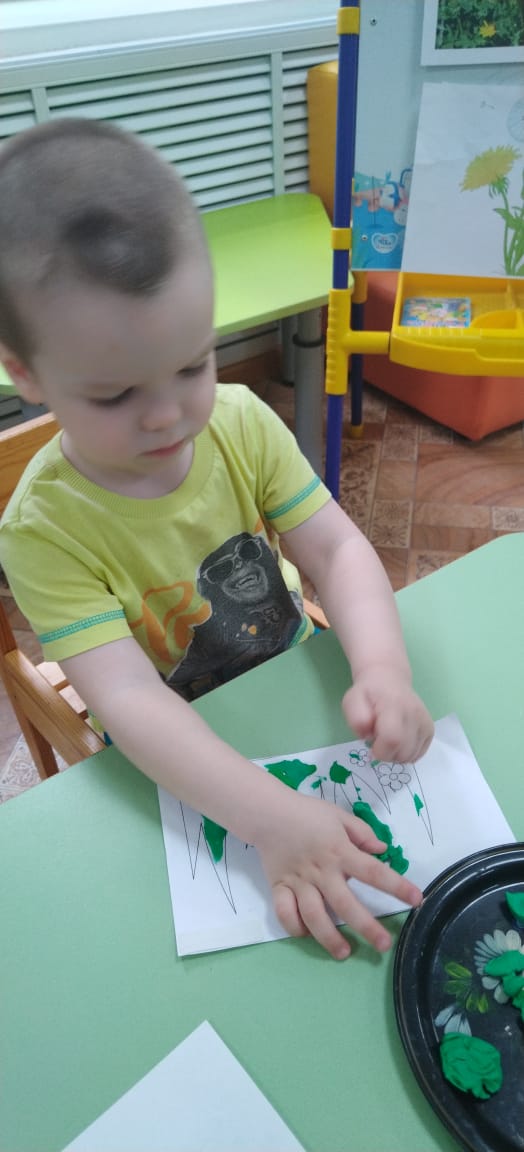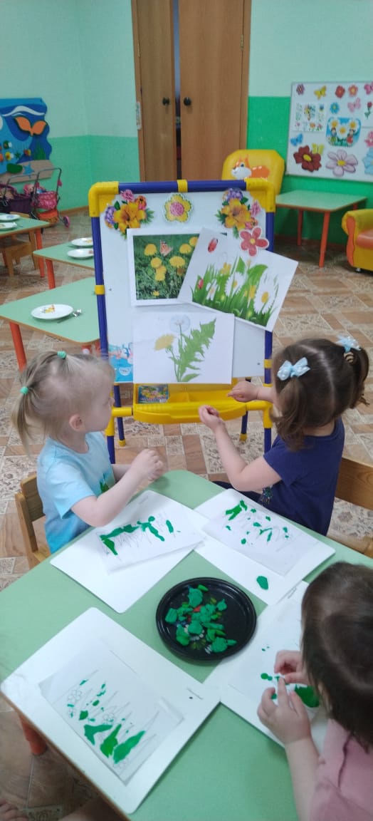 В рамках творческой деятельности дети лепили зеленую травку из пластилина. Они учились раскатывать пластилин между ладоней рук делая маленькие «жгутики», имитируя травку и смотрели как она становиться яркой и оживает. Такие творческие задания помогают развивать мелкую моторику рук и восприятие весенней природы.