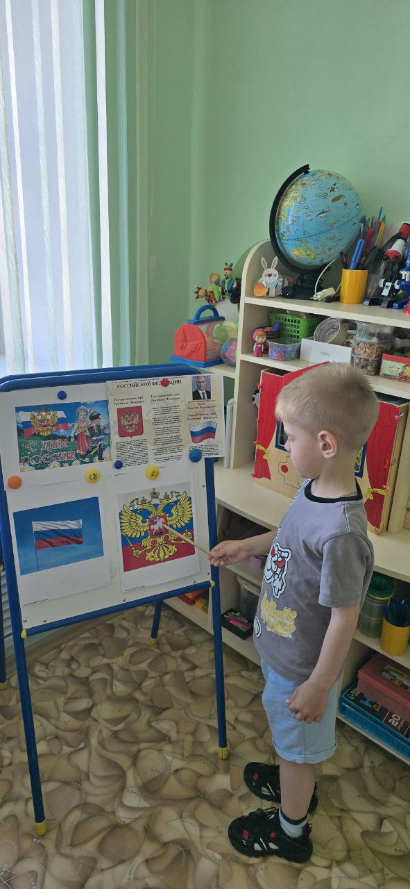 Воспитанники расширили свои знания о главных государственных символах: флаг, герб, гимн. Еще рассмотрели и дополнительные: матрешка, береза, тройка лошадей, самовар, балалайка и т.д.