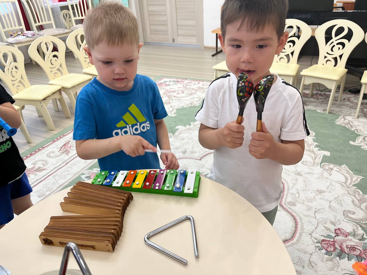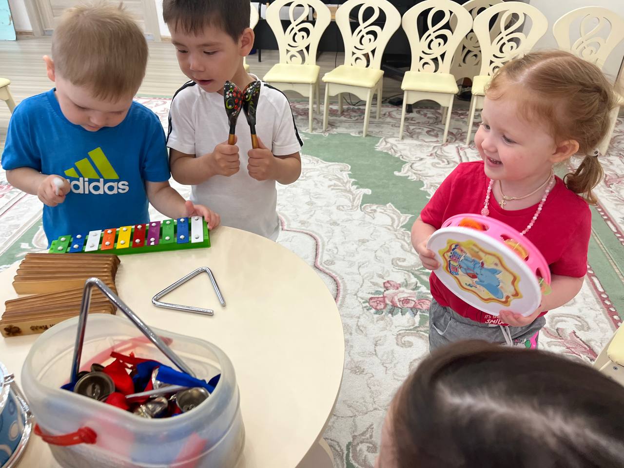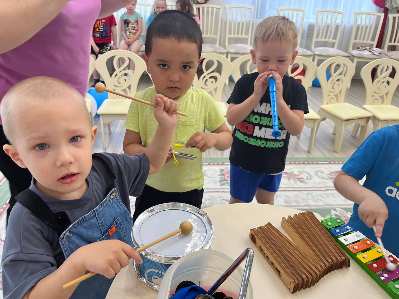 Музыка – источник особой детской радости. Ребята второй младшей группы «Сибирячок» очень любят и ждут музыкальные занятия. В этом возрасте возникают первые эстетические чувства, которые проявляются при восприятии музыки, подпевании, участии в игре или пляске и выражаются в эмоциональном отношении ребенка к тому, что он делает. Музыкальные занятия способствуют созданию психологического комфорта и эмоционального благополучия каждого ребенка. Сколько радостных эмоций вызывает музыка у детей! Когда звучит музыкальный инструмент, у ребят появляется улыбка, они подпевают, ритмично двигаются, хлопают в ладоши. Музыкальные инструменты для маленького ребенка – символ музыки тот, кто играет на нём – почти волшебник. Вот и сегодня наши ребята превратились в настоящих волшебников и с большим удовольствием создавали свои музыкальные шедевры с помощью музыкальных инструментов. Музыкальные инструменты для детей с самого юного возраста позволяют формировать их слуховой аппарат, тренировать двигательные навыки и даже развивать образное мышление.