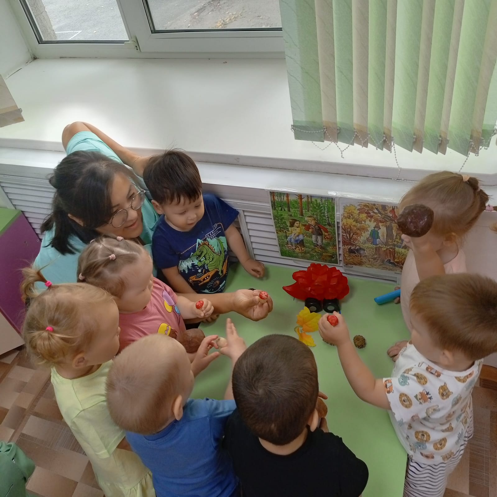 А ещё помогли ежику собрать вкусные грибочки для его друзей лесных ежат. С помощью аппликации "Грибочек" — каждый ребенок создал свой гриб, аккуратно приклеив шляпку и ножку у гриба. Малыши очень старались, создавая яркий осенний пейзаж.