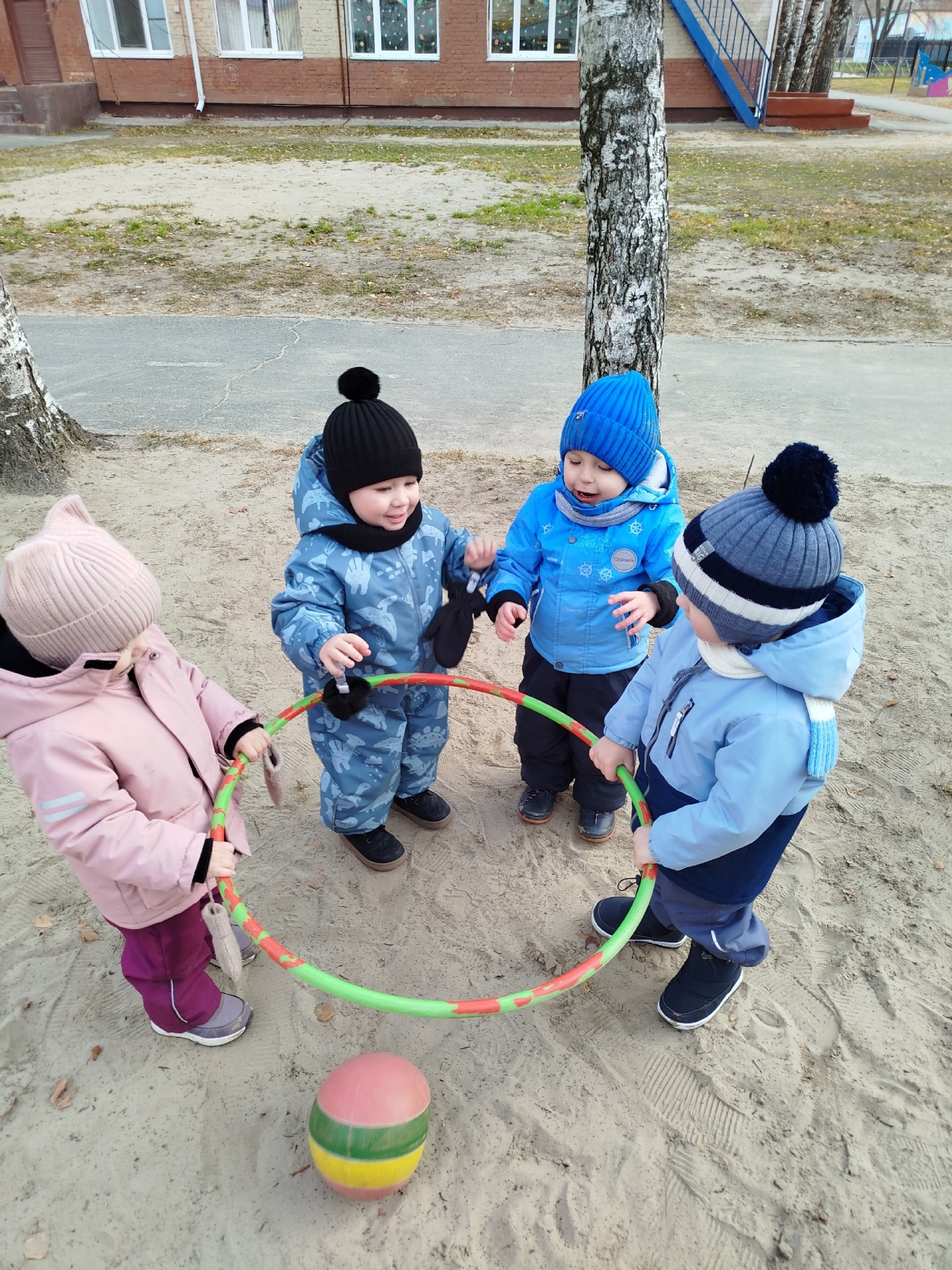 На прогулке ребята активно играют в подвижные игры: "Поподи в кольцо" — учимся метко бросать и попадать, а затем гонки на машинах — дети соревнуются и показывают ловкость и быстроту. Такие игры развивают координацию, зрительно-моторную связь и просто дарят массу улыбок!