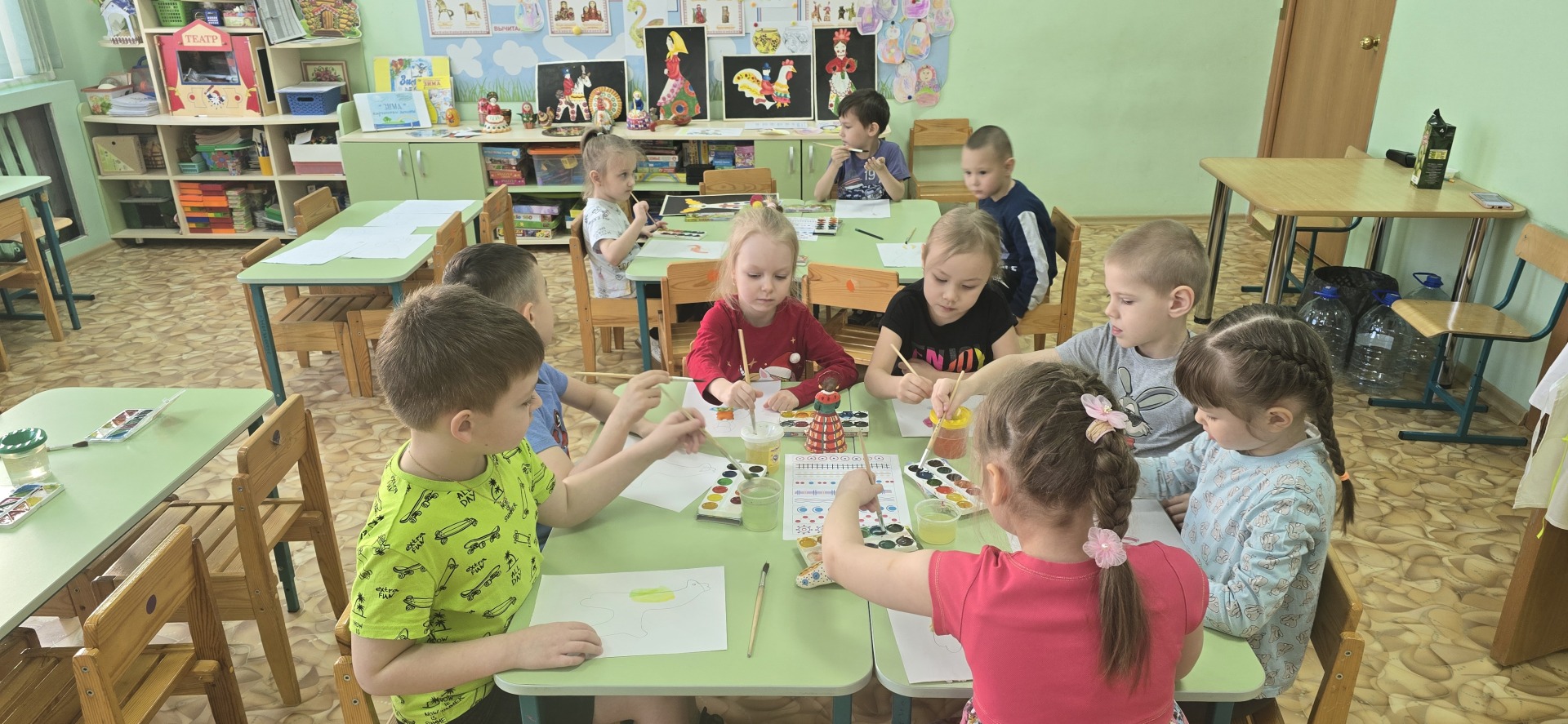 Приобщая детей к русской культуре, мы знакомили их с народными промыслами, рассказали о процессе изготовления Дымковской игрушки, учились выделять элементы Дымковской росписи и применяли ее на практике, расписали коньков, индюков, петушка узорами дымковской росписи.