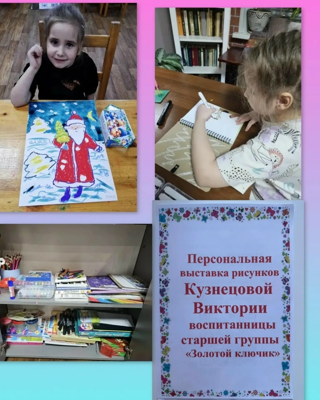 Так, в фойе детского сада оформлена выставка юной художницы из старшей группы «Золотой ключик» – Кузнецовой Виктории.