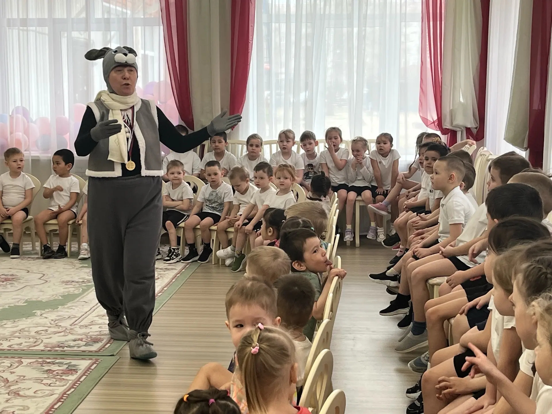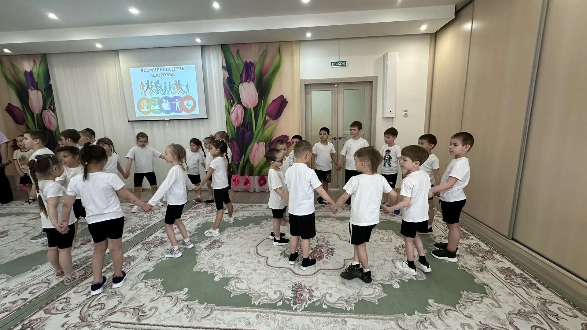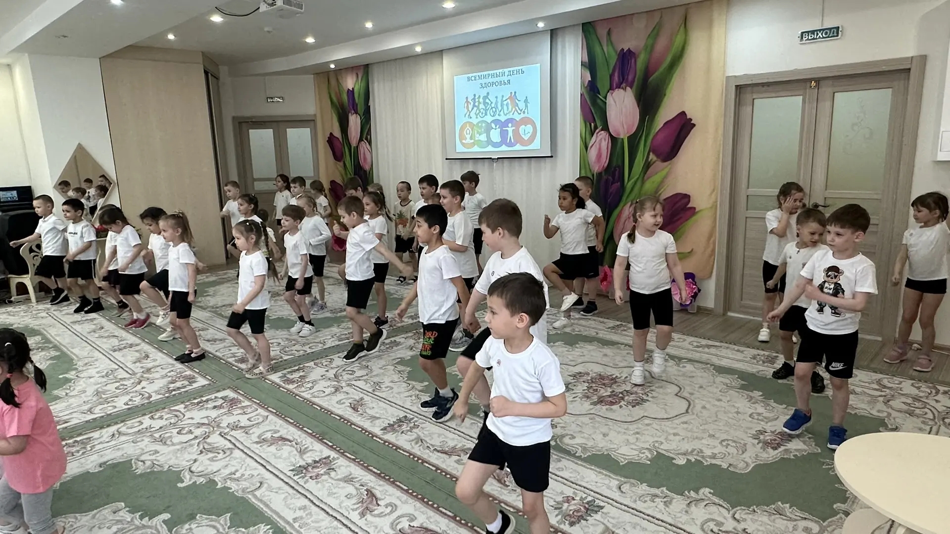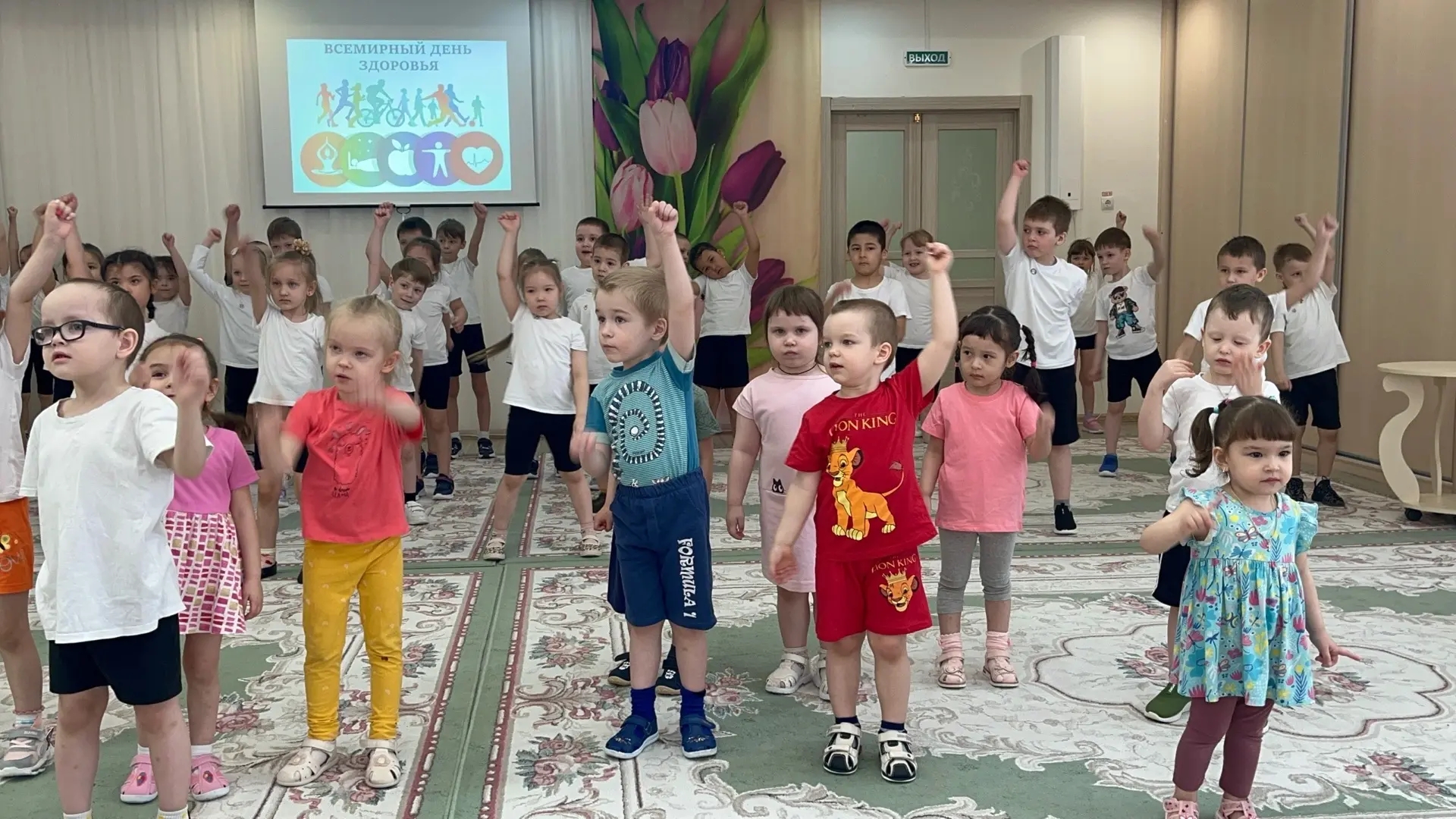 Всем известно, в апреле отмечается Всемирный день здоровья. Воспитанники нашего детского сада отметили этот праздник с пользой. Ребята встретились с лесным гостем - Зайцем Тишкой, который мечтает стать олимпийским чемпионом по бегу. Но он, к сожалению, очень часто болеет. Ребята подсказали Тишке, что нужно делать для того, чтобы не болеть: соблюдать режим дня, делать утреннюю зарядку, правильно питаться, закаляться и быть всегда в хорошем настроении. Все это они показали своему лесному гостю в веселых играх «Поздороваемся разными частями тела», «Веселая зарядка», «Овощи и фрукты - полезные продукты», «Солнце, воздух, вода», «Раз, два, три – к спортивному оборудованию беги!», «Передай гантели в колонне», «Футбол в кругу», а в заключении все вместе станцевали веселый танец «Здоровый образ жизни». Ну, а веселый смех и хорошее настроение были у ребят на протяжении всего праздника!