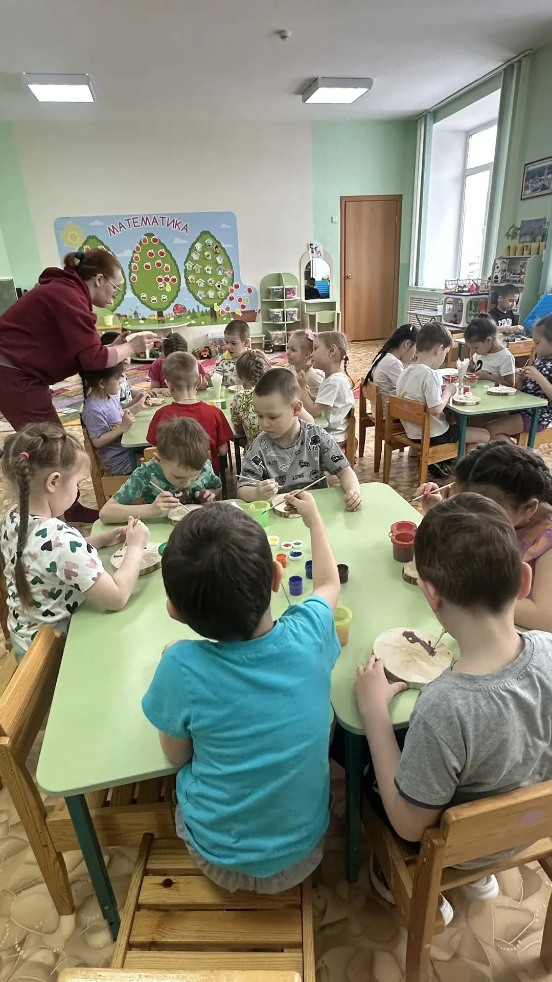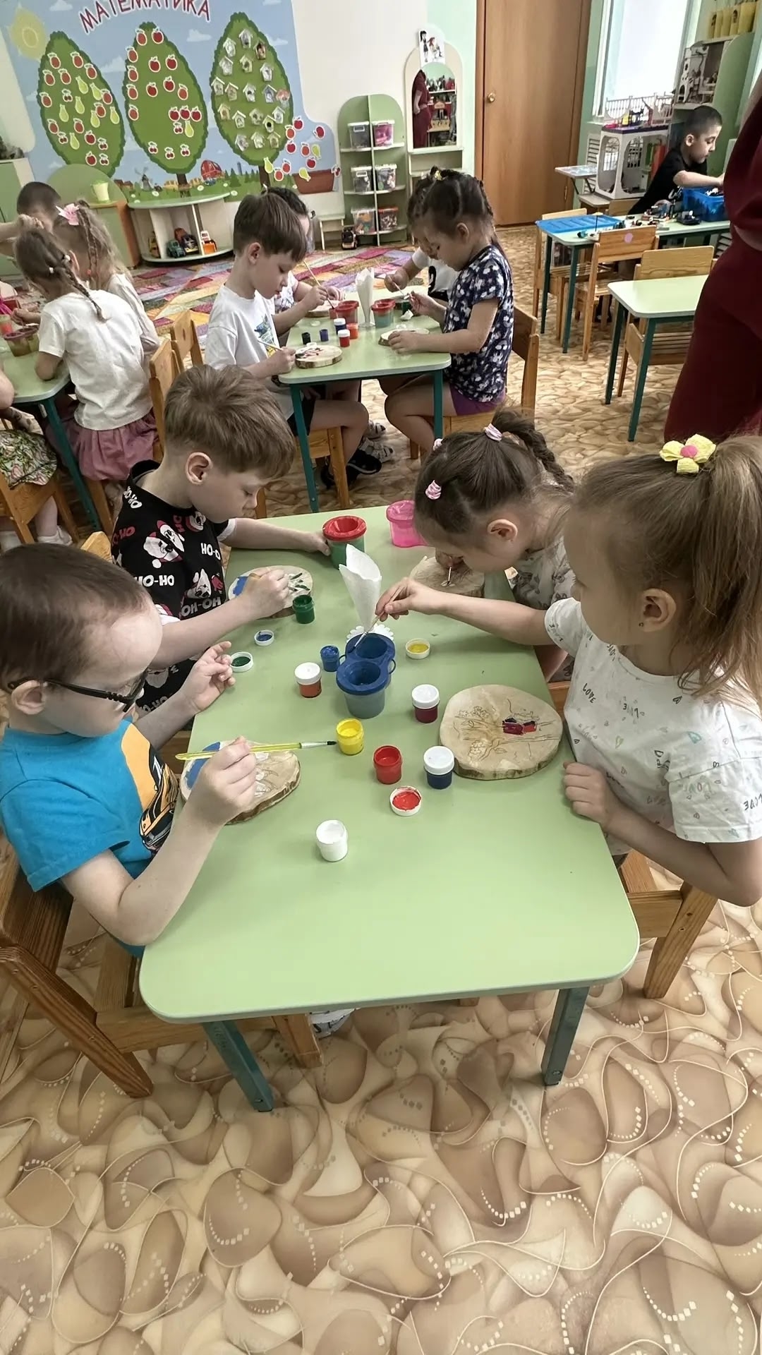 Ребята группы " Золотой ключик" открыли для себя удивительный мир рисования акриловыми красками на спилах дерева в мастер-классе нашей гостьи Меликсетовой Валентины Александровны. Это было настоящее погружение в весеннюю природу и создание шедевров на спилах деревьев.