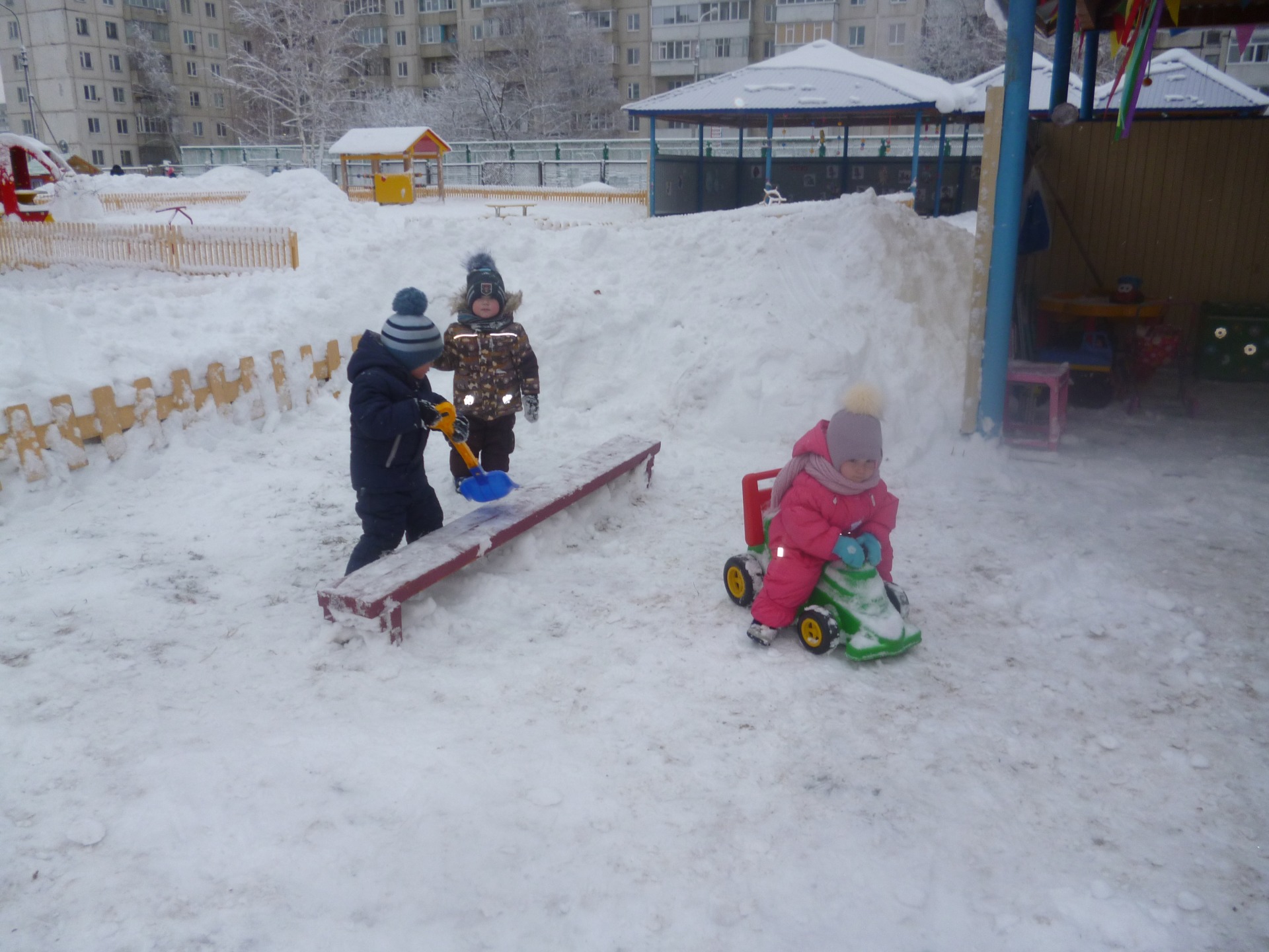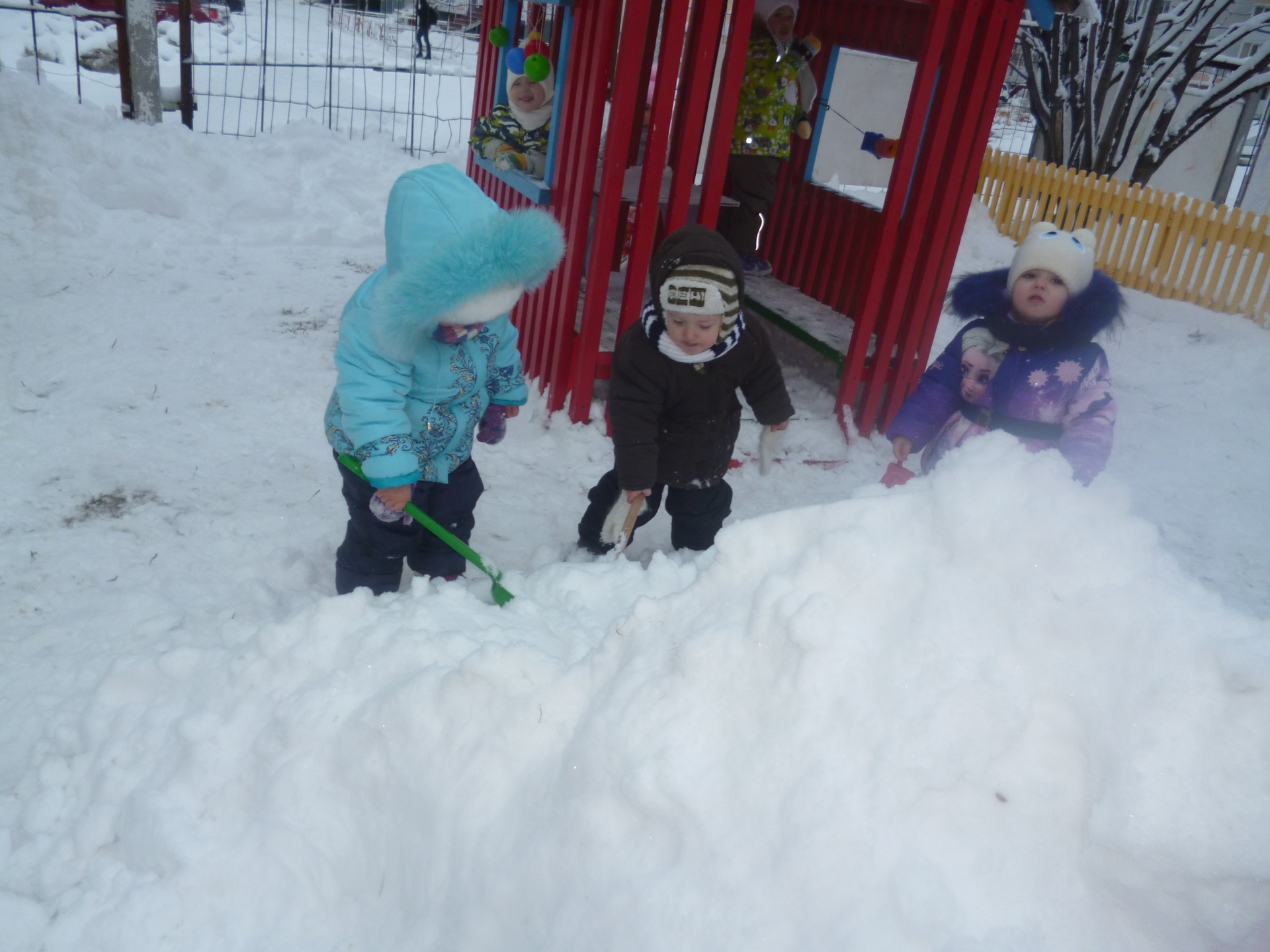 Итак, время адаптации позади. За лето, осень мы подросли, привыкли друг к другу и подружились. От души порадовались первым снежинкам, первому снегу, любовались красотой зимней природы. Зима дарит нашим деткам много радости, особенно на прогулке. Мы научились лопатками на своём участке разгребать снежок и собирать его в кучки.