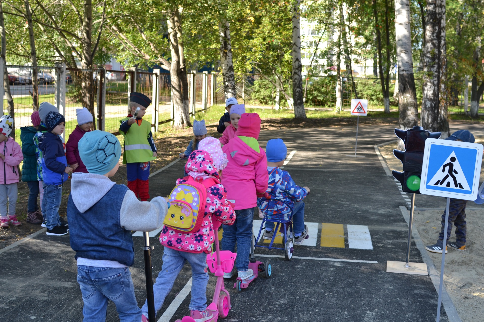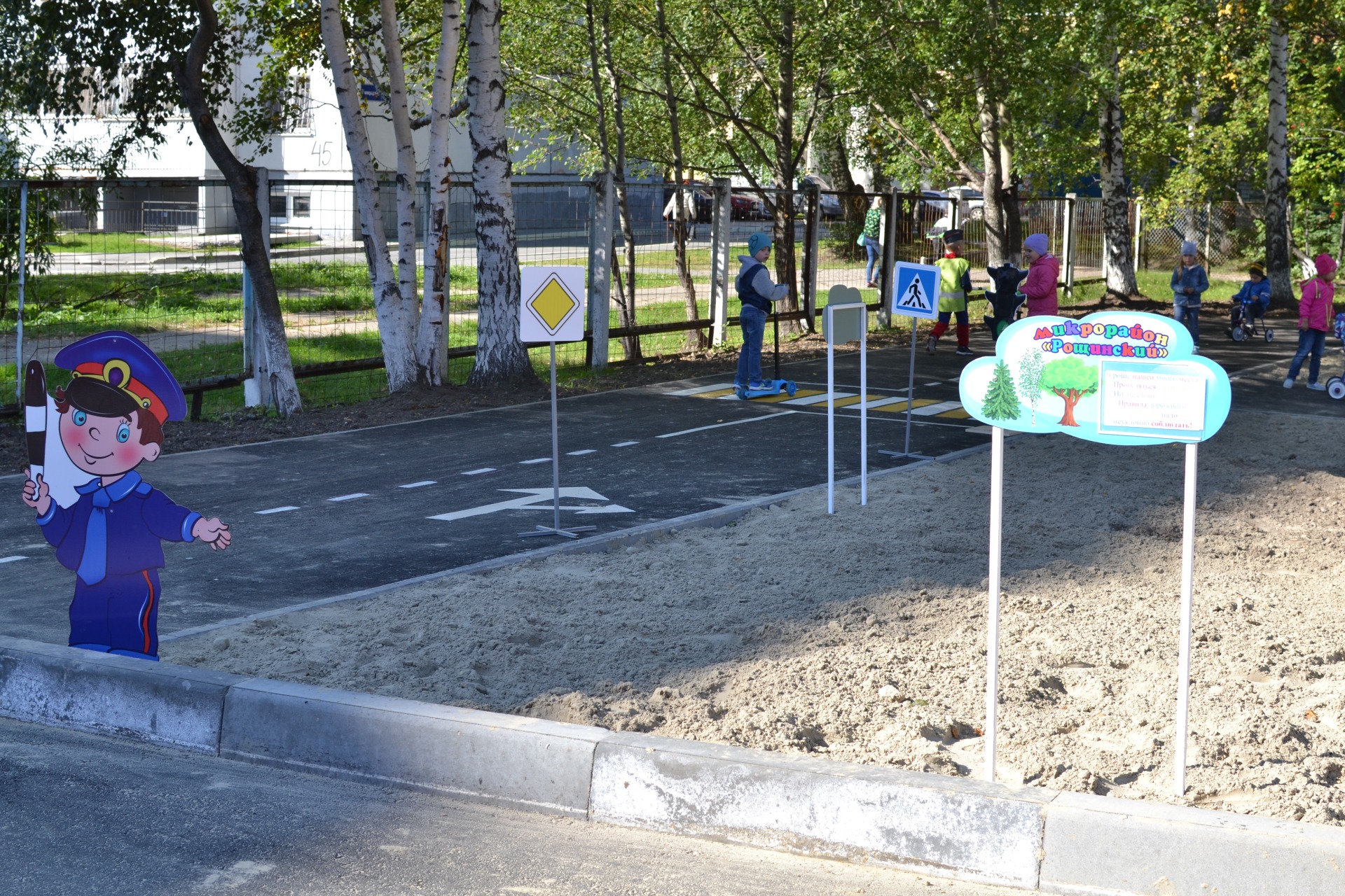 Для организации деятельности с детьми созданы игровые микрорайоны и площади: стадион, пункт ДПС и парковка, площадь Игровая, парк развлечений и др. Одним из таких тематических уголков на территории сада является "Микрорайон Рощинский"