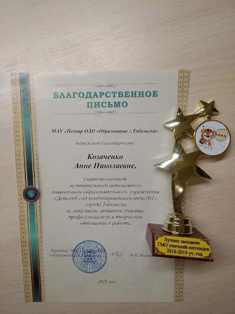 Итогом проделанной работы стало вручение на итоговом заседании городского методического объединения учителей-логопедов благодарственного письма «за энтузиазм, активное участие, профессионализм и творческое отношение к работе», а также по результатам голосования коллег, заседание ГМО учителей-логопедов, проведенного в МАДОУ «Детский сад №1» г. Тобольска, было признано лучшим по результатам 2018-2019 учебного года и вручен кубок.