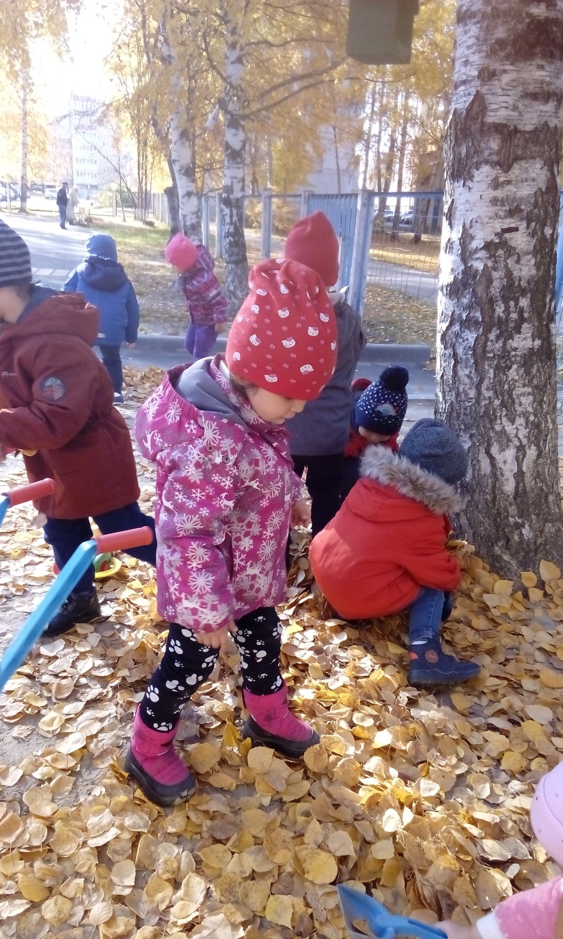 На прогулке, ребята очень любят собирать листья и играть в различные игры: «Найди самый большой лист», «Кто больше соберёт листьев», «Кто громче зашуршит листьями».