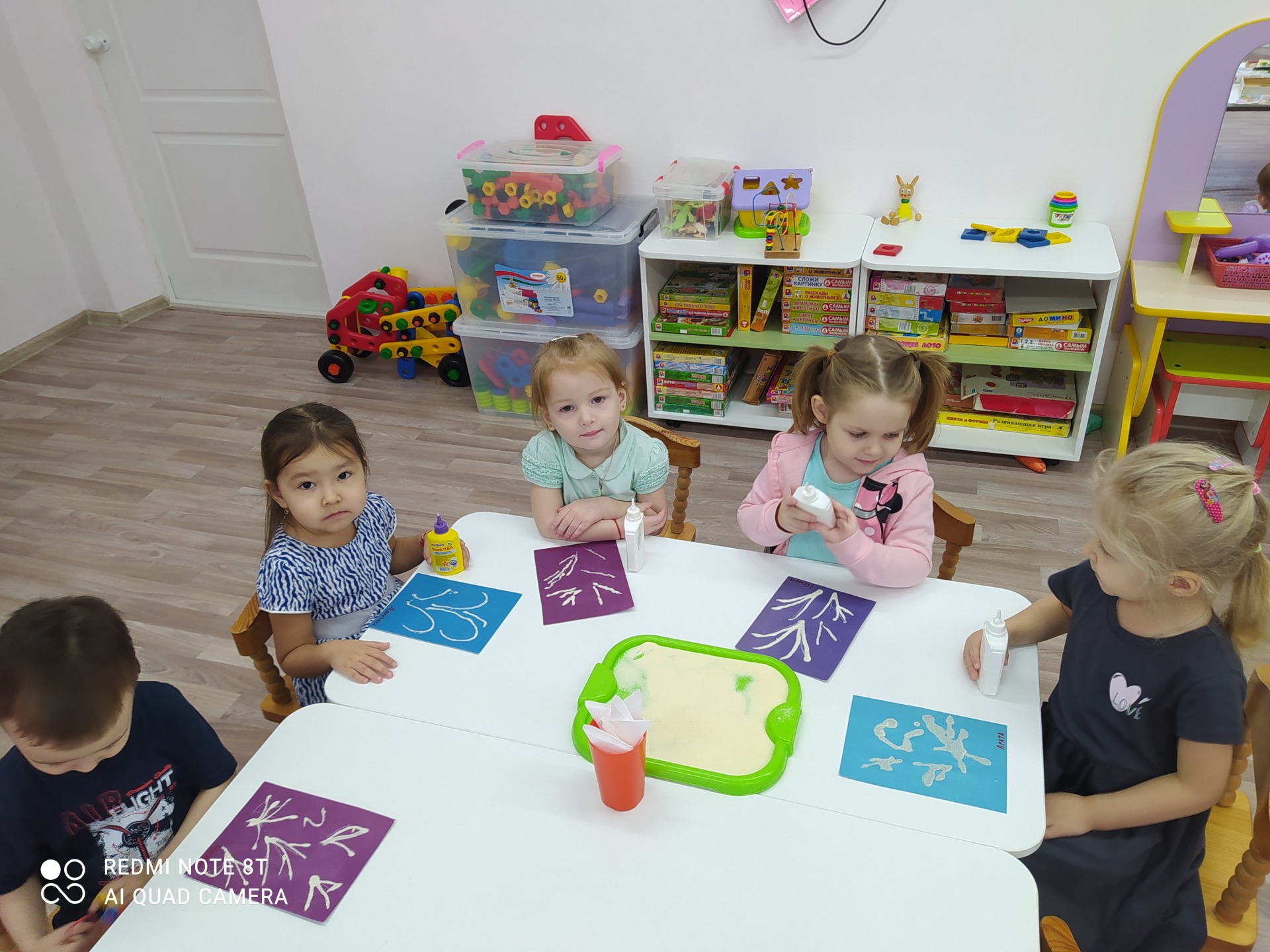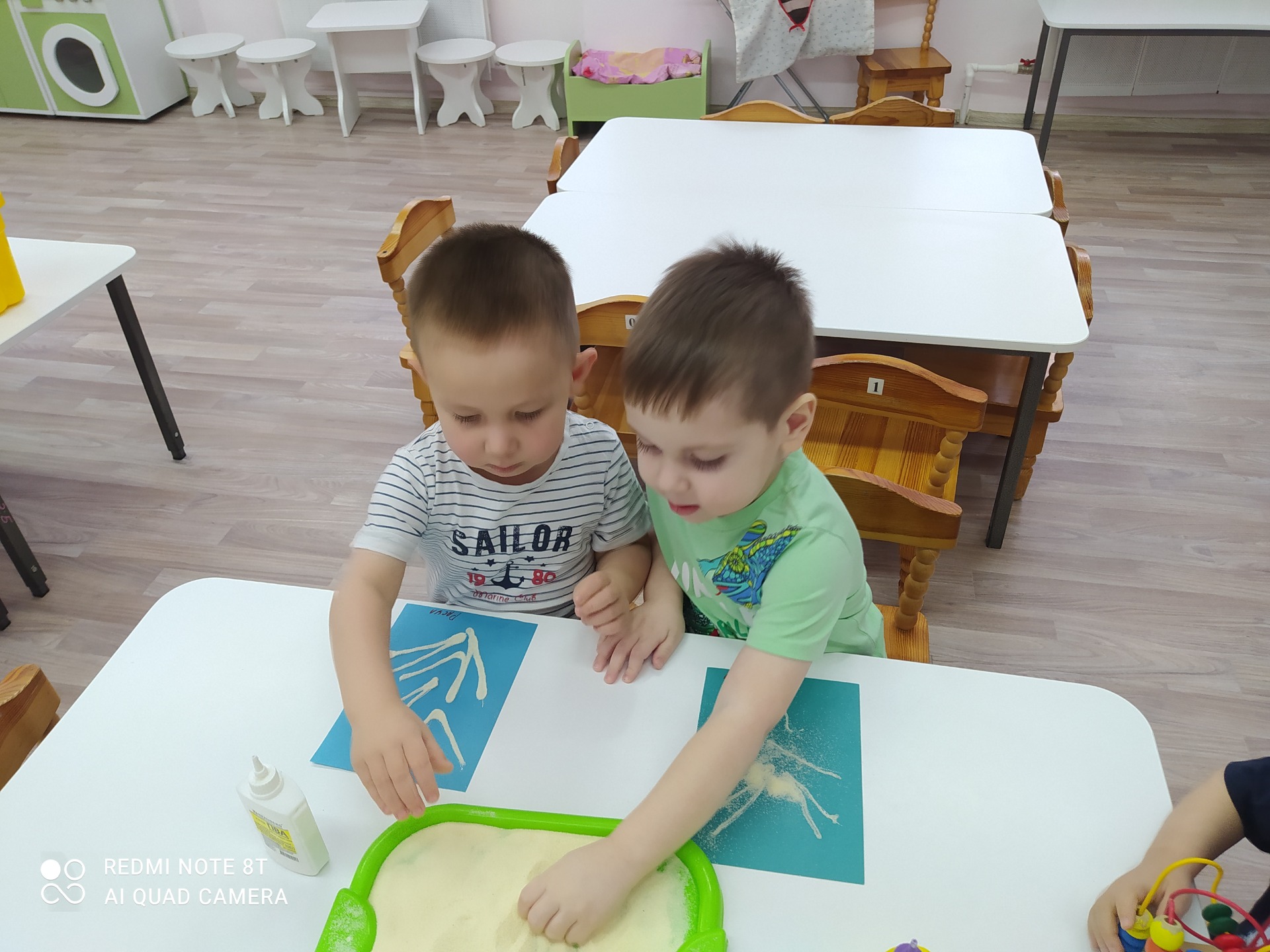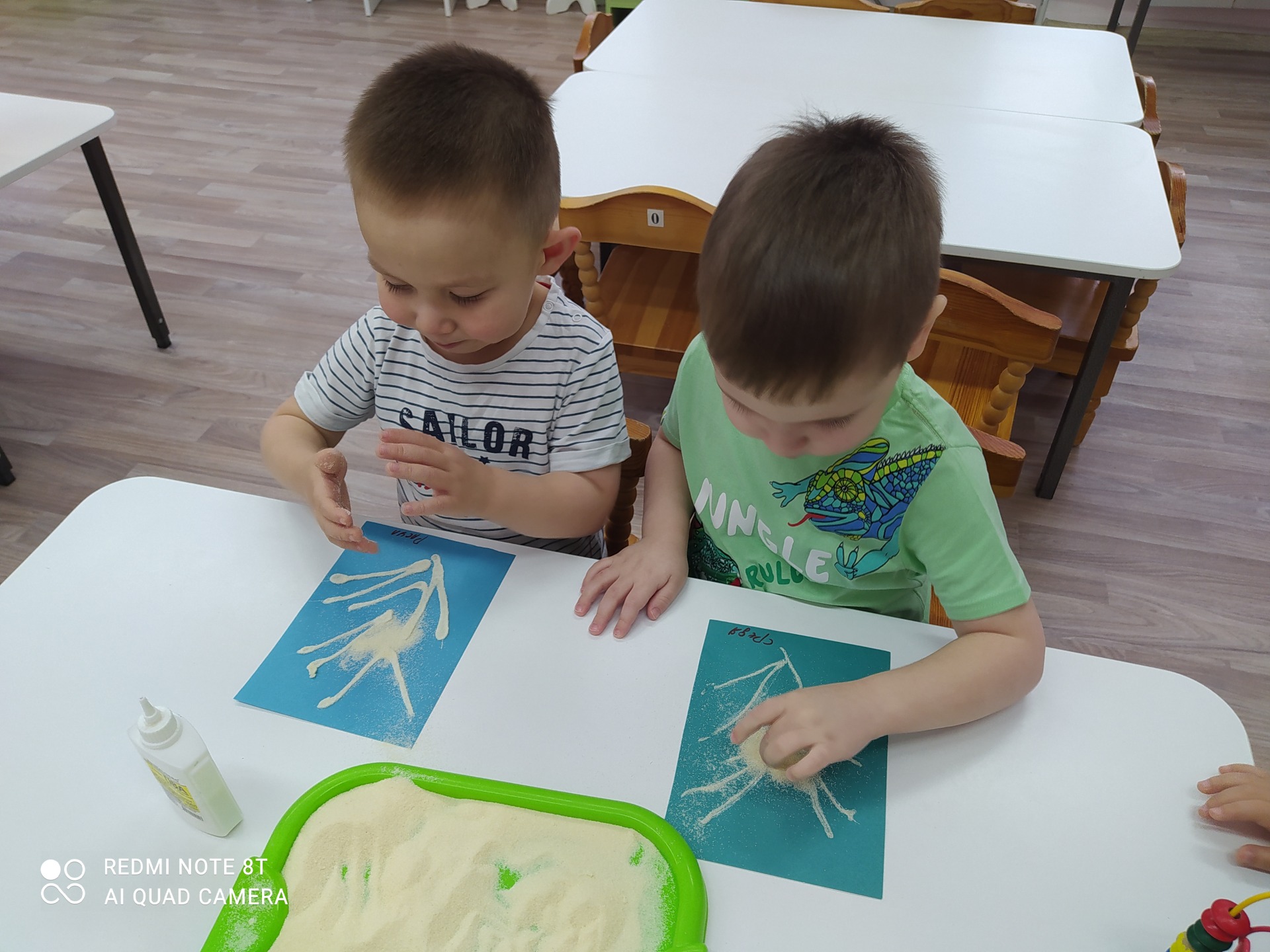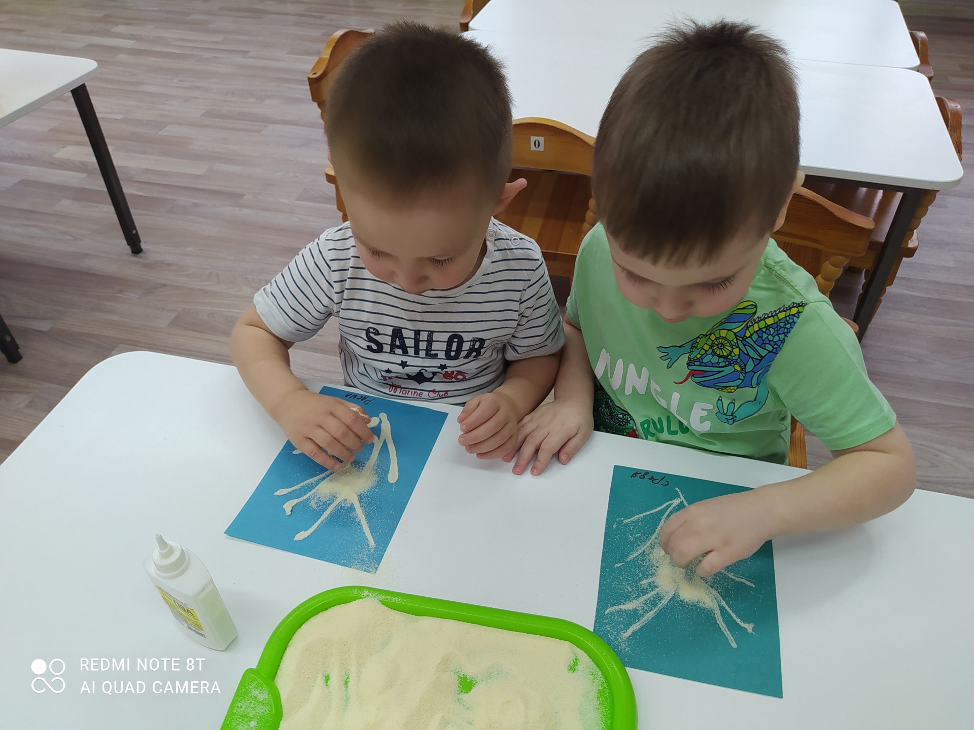 дети нанесли узор карандашом на тонированную бумагу и этот рисунок покрыли клеем ПВА.