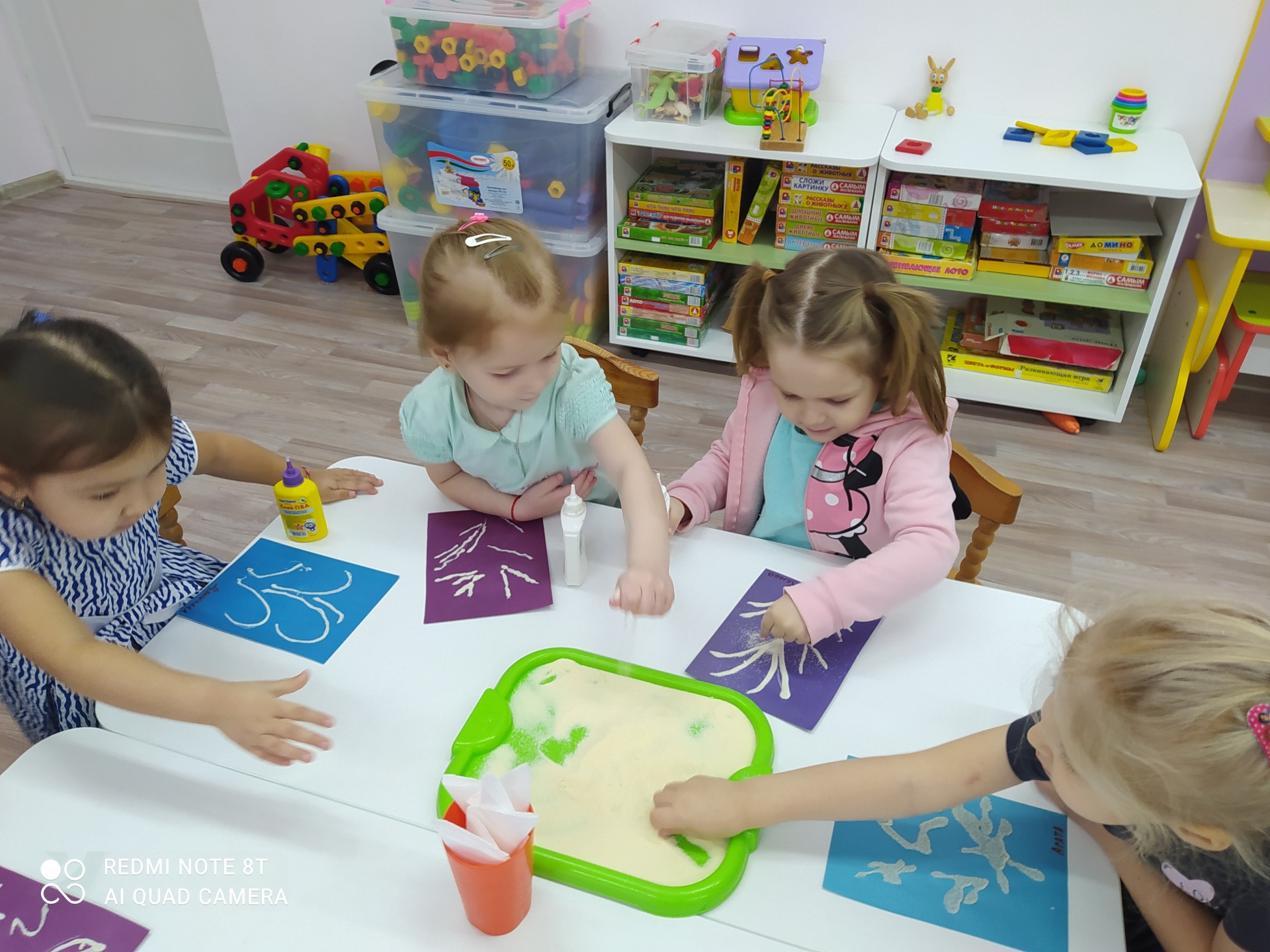 Потом начали превращать наш рисунок в морозный узор, засыпая его манкой. Лишнюю крупу ссыпали и получался объемный морозный узор.