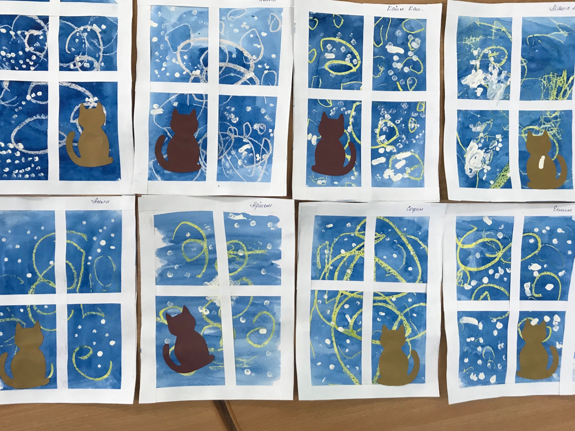 А прочитав, прочитав стихотворение Андрея Эйсмонта «Кот уставился в окно» нам захотелось использовать наши готовые морозные узоры и сделать аппликацию, добавив котика и падающий снег (ватными палочками). И вот что у нас получилось.