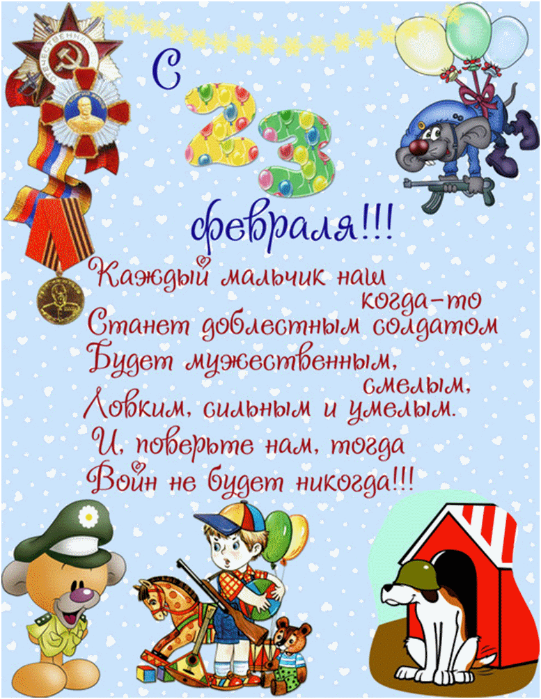 Каждый год в конце зимы, 23 февраля, все мы отмечаем праздник — день защитника Отечества. Это праздник настоящих мужчин — смелых и отважных, ловких и надёжных, а также праздник мальчиков, которые вырастут и станут защитниками Отечества. Это возможность лишний раз напомнить мальчикам о том, что такое смелость, отвага, благородство и мужество. Защитники есть в каждой семье: дедушки, дяди, старшие братья и, конечно же, наши любимые папы. Мужчины по праву считаются защитниками нашей Родины, нашего Отечества. Недаром даже слова «отец и Отечество» начинаются одинаково: они близки друг другу по смыслу. Отечество – это наша страна, Родина. Это так же день памяти всех тех, кто не щадил себя ради Отечества, кто до конца оставался верен воинскому долгу.