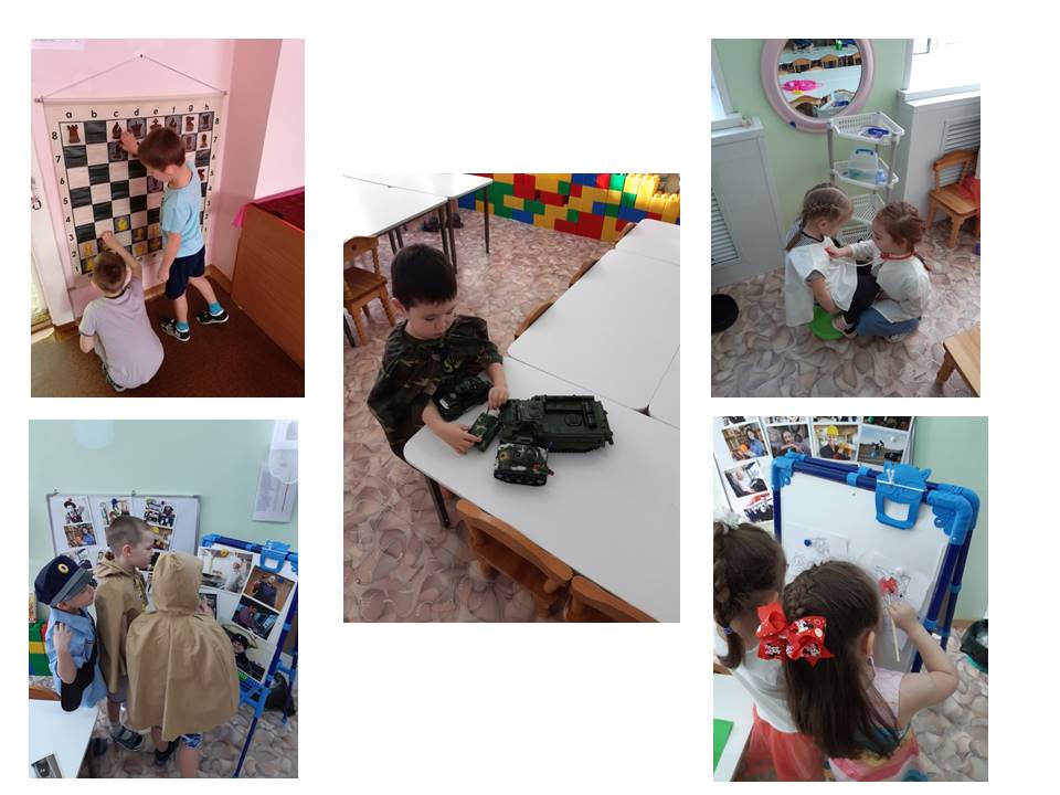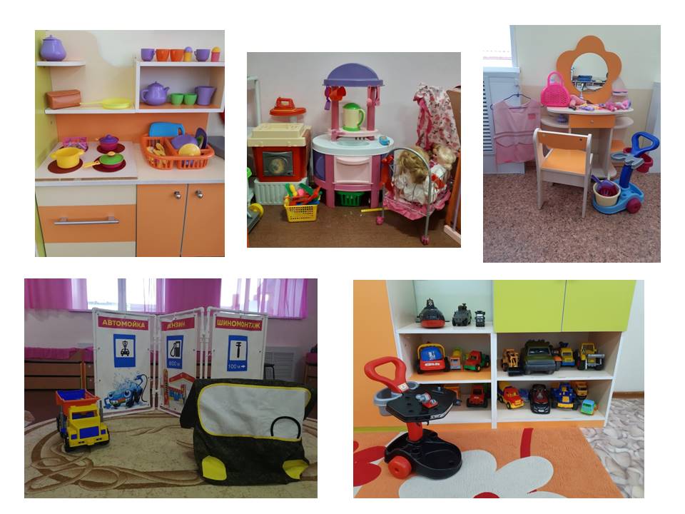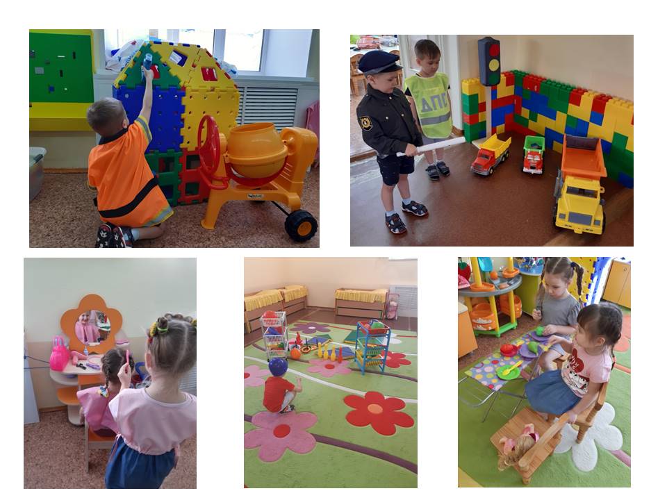 Все игровые центры в группах направлены на то, чтобы ребёнок умел творчески комбинировать и отражать в играх впечатления от реальной жизни - посещение больницы, школы, магазина, почты, парикмахерской, поездку в автобусе и т.д. Посещая салон красоты в группе «Чиполлино», кто то хочет стать парикмахером, а примерив костюм строителя, Артём воплощает свою мечту и строит дом из большого цветного конструктора. В спортивном уголке наши дети превращаются в футболистов, игроков боулинга сбивая кегли, играют в теннис. Повторив правила дорожного движения можно управлять порядком на дорогах, ведь для этого всё есть и светофор, и нужный костюм.