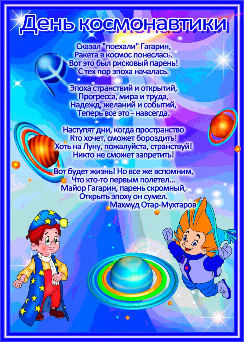 На познавательных беседах ребята с большим интересом слушали рассказы о первом человеке, отправившемся покорять космическое пространство — Юрии Гагарине, о собачках Белке и Стрелке, которым удалось до человека побывать в космосе, узнали много интересного об учёных, стоявших у истоков развития космонавтики, о планетах Солнечной системы, о космических полётах. Они с удовольствием представляли себя «космонавтами в невесомости», «инопланетянами». Теперь у некоторых ребят появилась мечта — полететь в космос. Кто знает, быть может, когда-то, для кого-то из них это станет явью.
