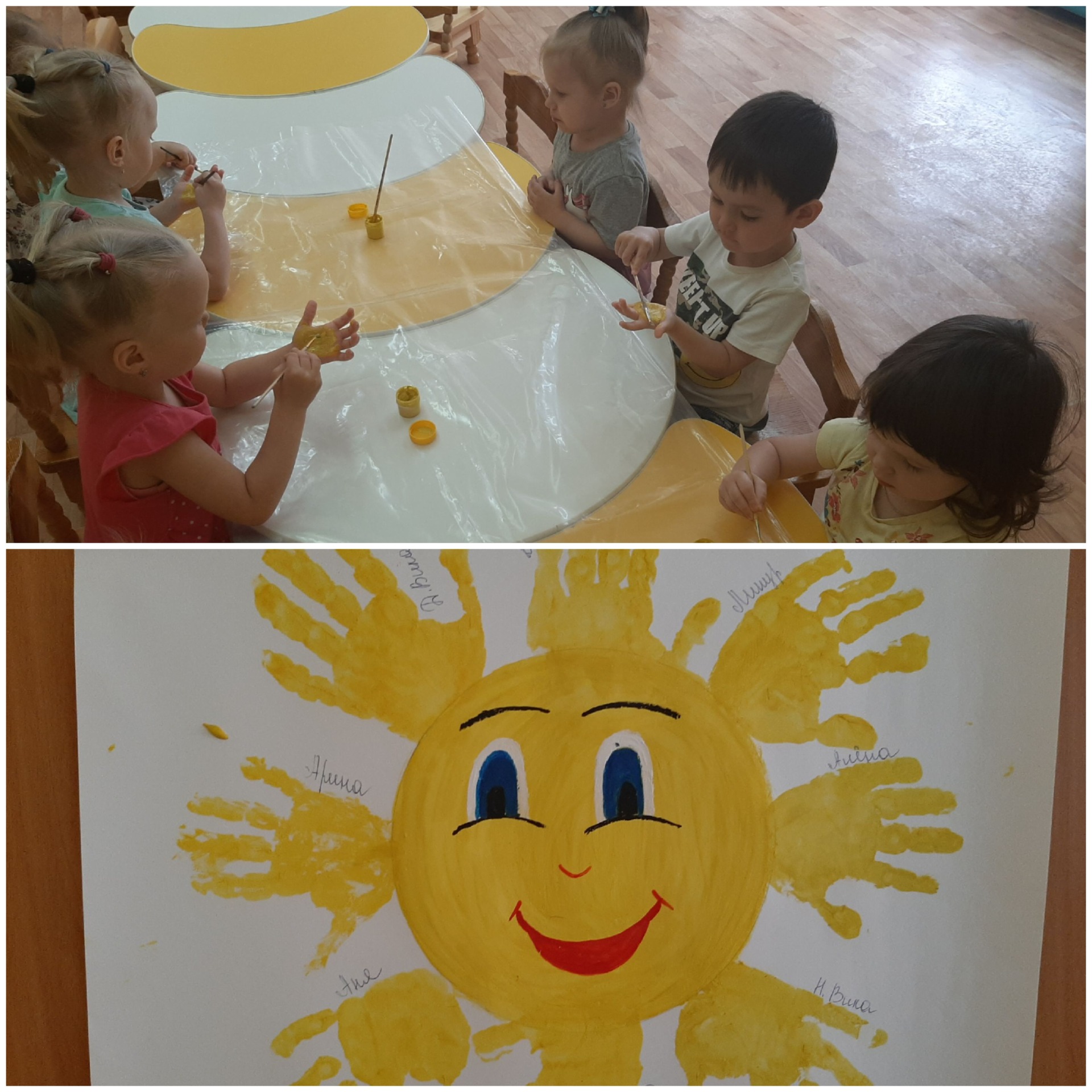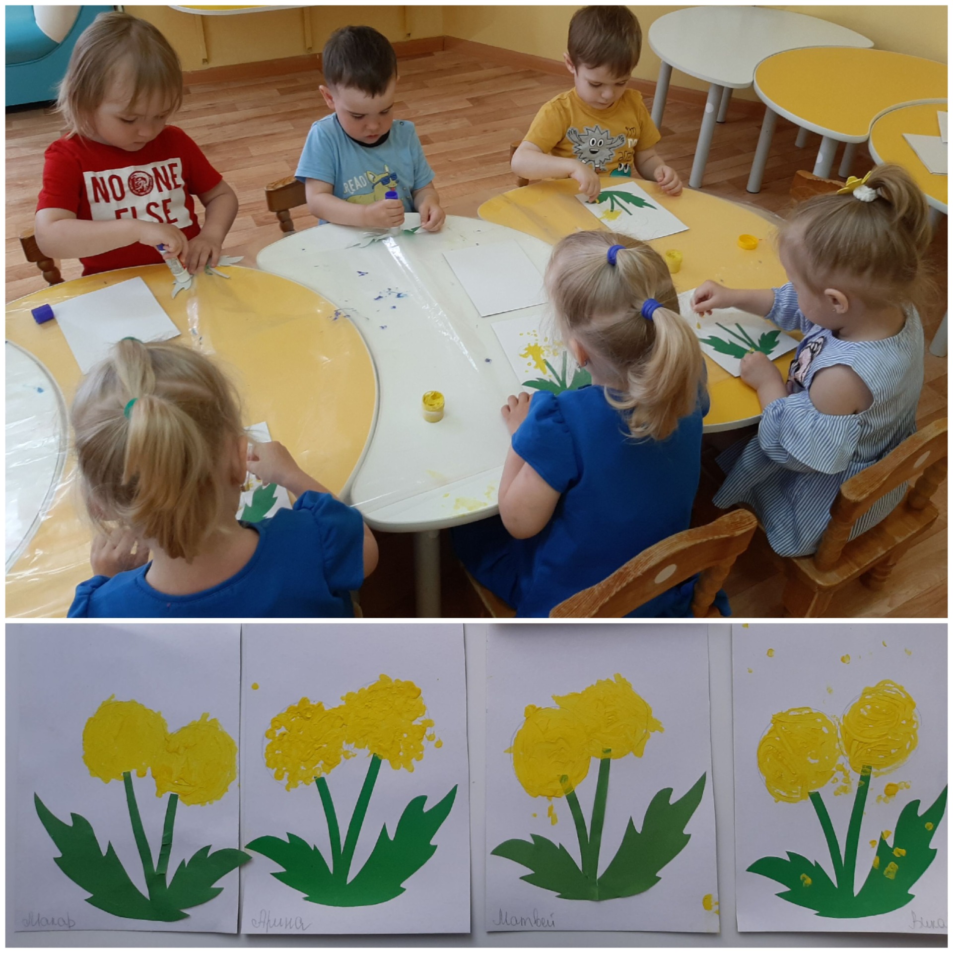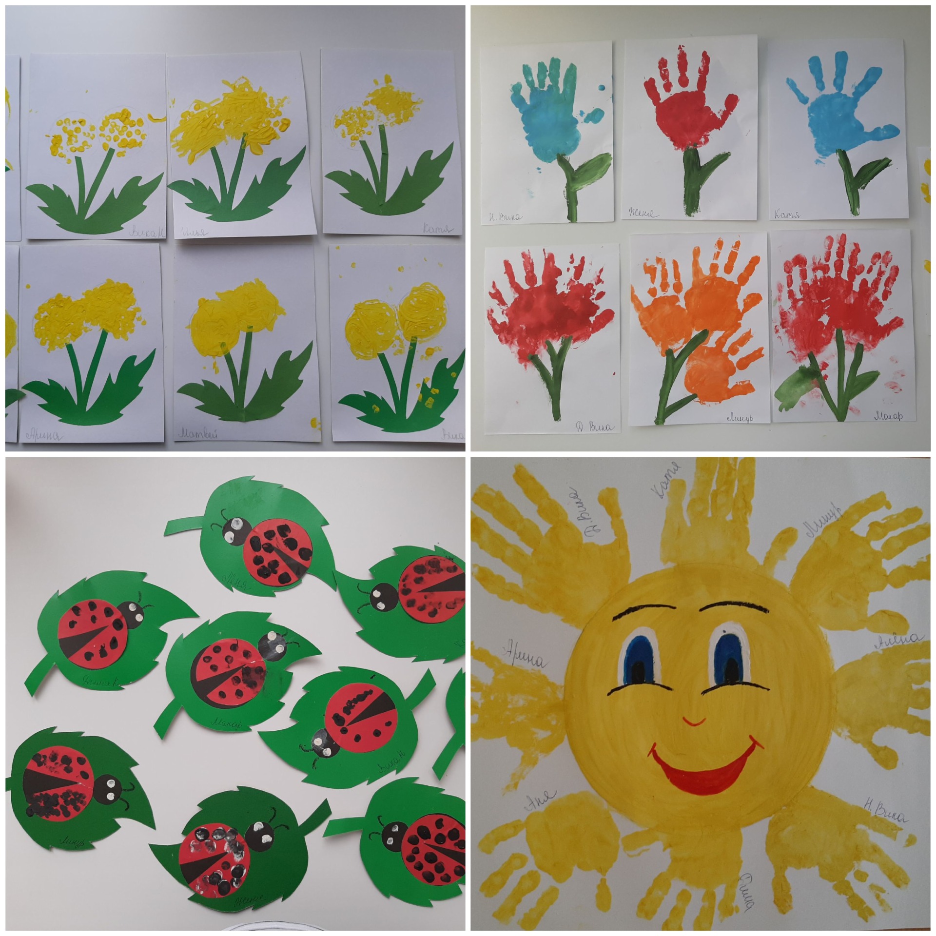 Так получились красивые одуванчики, весёлое солнце, цветы, божья коровка.