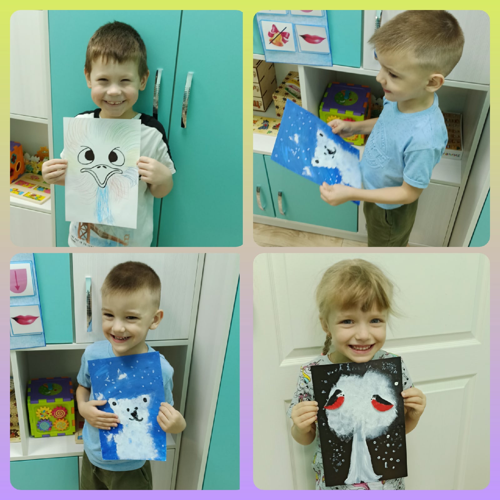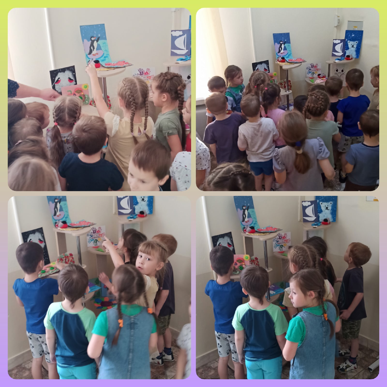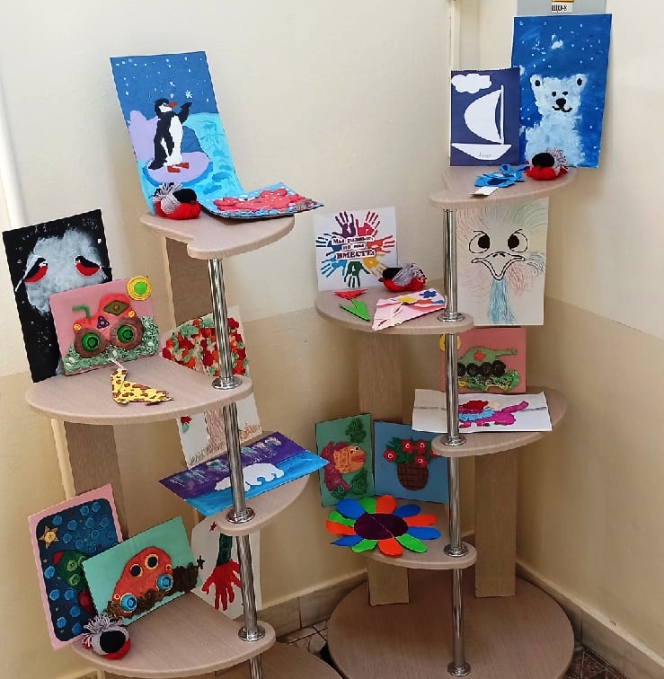 В холле детского сада организована выставка детских работ "Мы разные, но мы вместе", которую активно посещают группы совместно с воспитателями, а также родители.