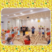 Ребята весело станцевали танец с листочками, а затем закружились в листопаде из ярких листьев. Далее пробовали «плести» веночки из листьев определенного цвета. А потом, хоровод «Огородная» перенес детей в овощной огород, где они перевоплотились во вкусных и полезных овощей. Все ребята проявили большую активность, подарили друг другу хорошее настроение, радость общения и улыбки!