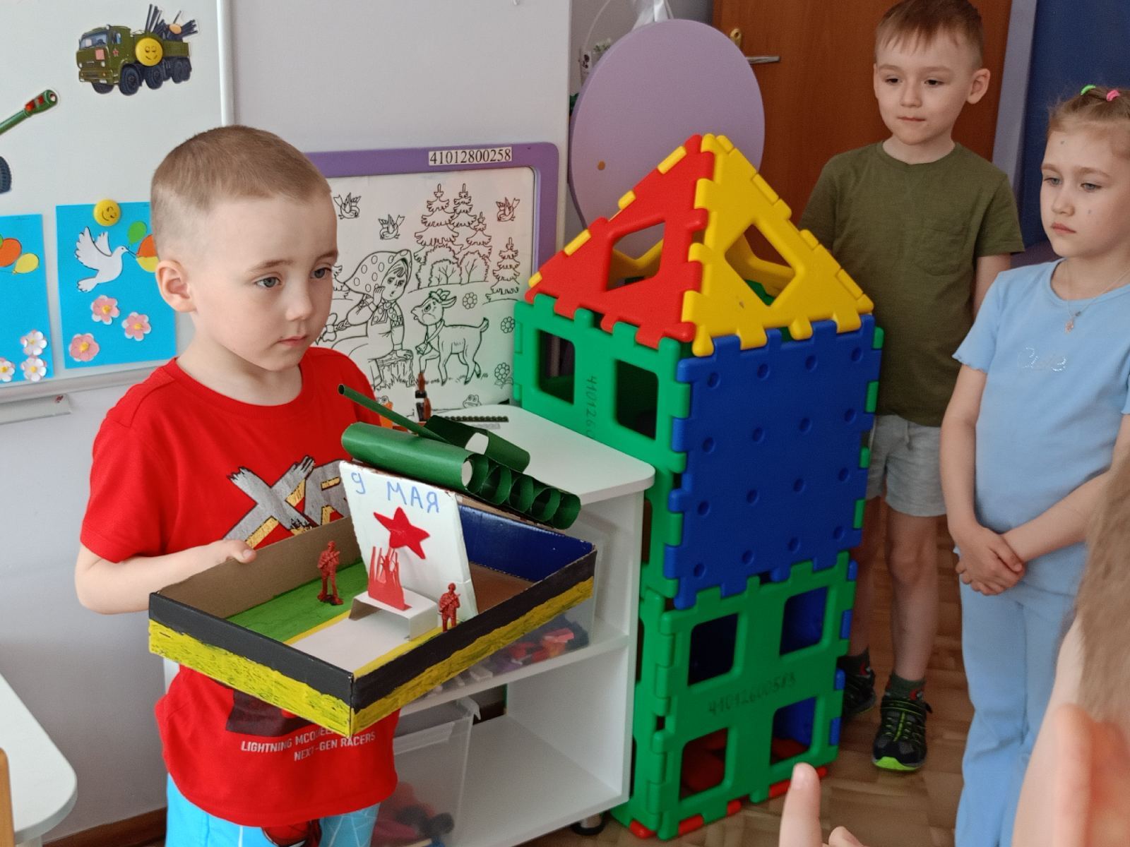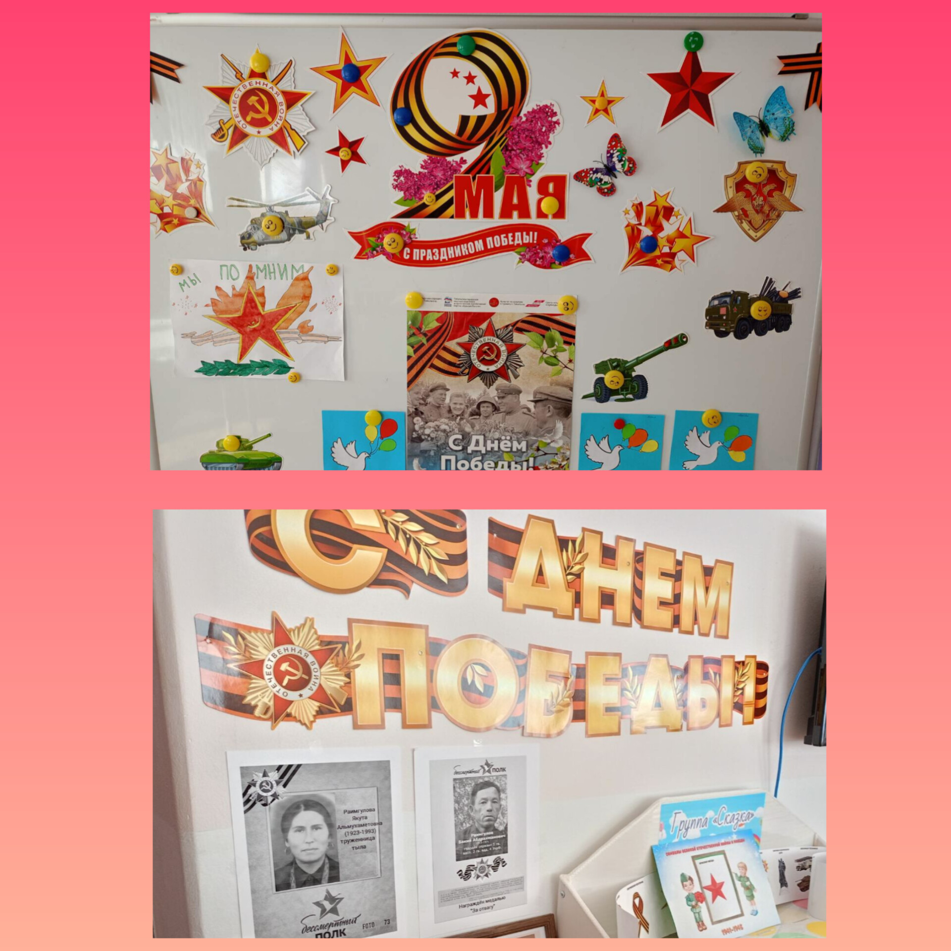 День Победы остается в России самым трогательным и главным праздником! Мы не должны допустить, чтобы наши дети забыли о войне и её героях, защищавших нашу страну. Все первые дни весны были посвящены тематической неделе «Весна! Победа! Май!» В старшей группе «Сказка» был оформлен стенд «Символы Великой Отечественной войны и Победы» с фотографиями прапрадедушек, прапрабабушек – солдат Великой войны и работников тыла. Также были представлены макеты памятников военной техники.