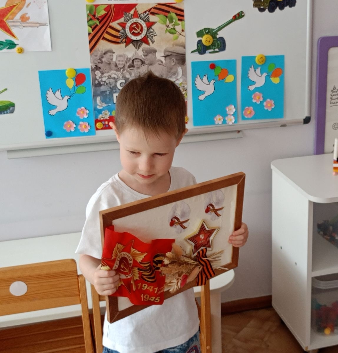 В ходе тематической недели, через беседы: «Праздник со слезами на глазах», «По дорогам войны», просмотра презентаций «Как это было», «Города – герои», чтения художественного произведения А. Гайдара «Сказка о военной тайне, о Мальчише – Кибальчише и его твердом слове» пополняли знания детей о Великой Отечественной войне. Играли в сюжетно – ролевые игры «Мы – моряки», «Радисты». Творческая продуктивная деятельность тоже была посвящена дню Победы.