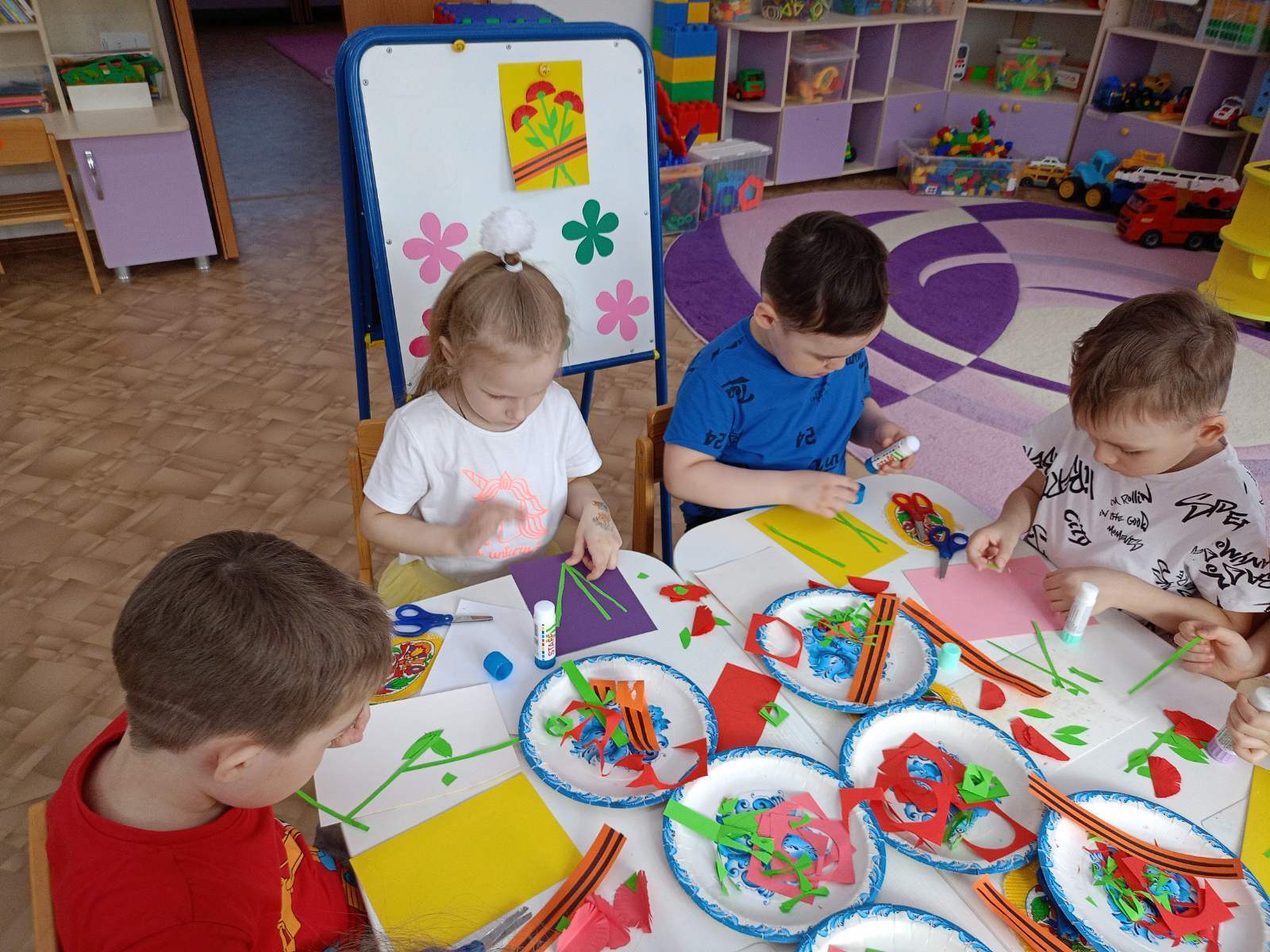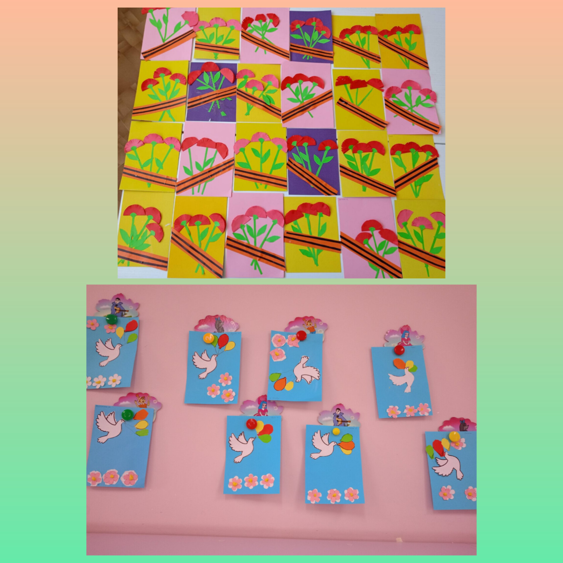 Дети помогали выстригать символики для оформления окон «Салют Победы», лепили «Вечный огонь», с любовью изготовили поздравительные открытки «С праздником!». Для родителей дети приготовили выставку творческих работ «Майские праздники».