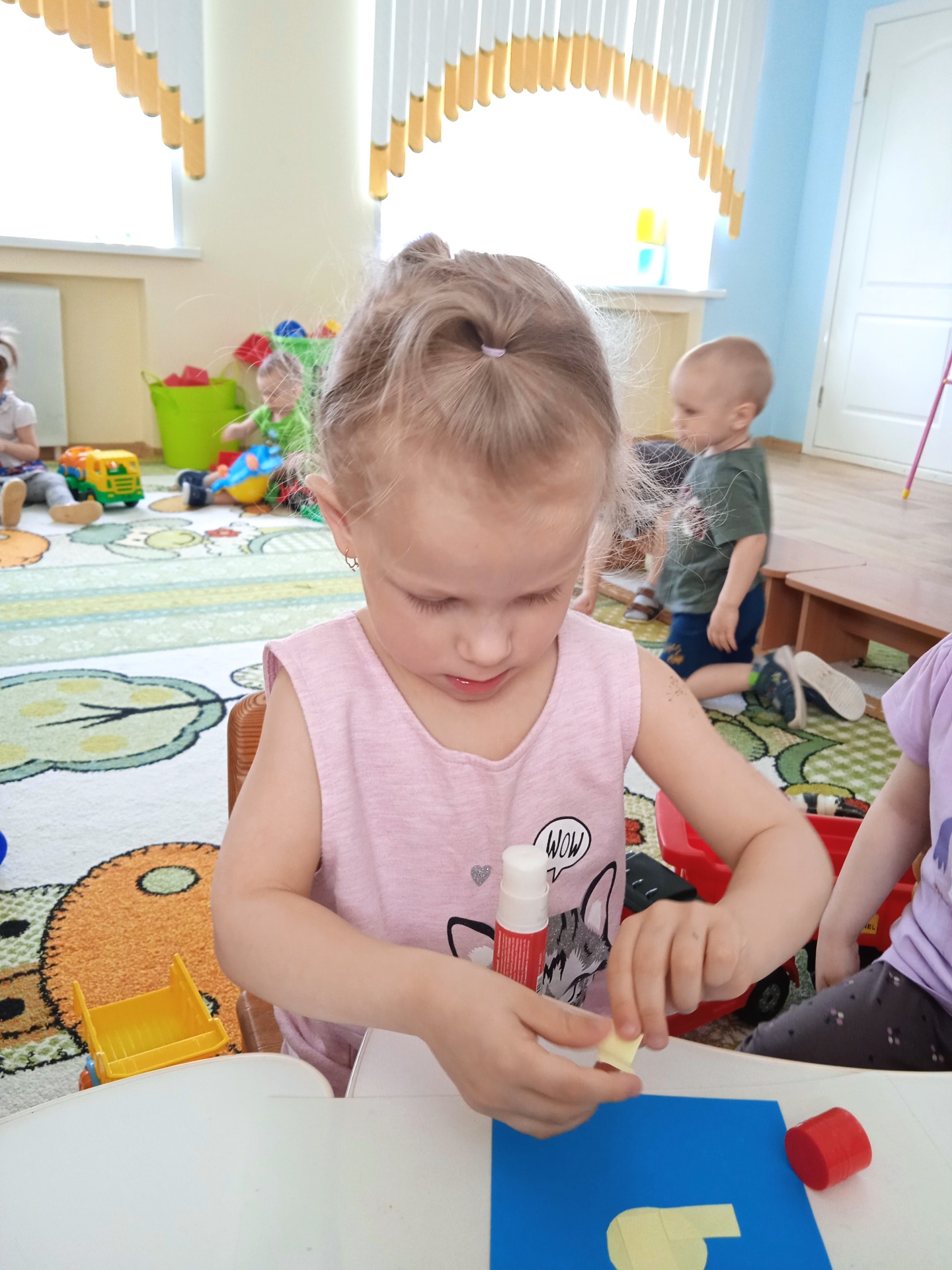 На прогулке мы с детьми наблюдаем за весенним солнышком, дети радуются ярким лучикам, с удовольствием ловят "Солнечных зайчиков", ведь солнышко теплое, ласковое. Вместе с ребятами мы сделали аппликацию солнышка. Дети учились приклеивать готовые детали на основу, создавая образ солнца, еще закрепили геометрическую фигуру круг.